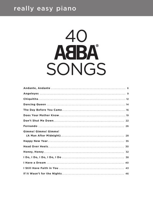 40 of ABBA's most popular hits in easy-to-play arrangements for piano, presented with background notes and performance tips for every song. These arrangements have been abridged and simplified for the beginner player, so structure and key signature may vary from the original recordings.