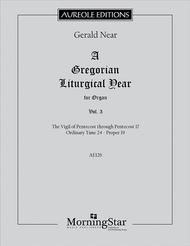 “The first two volumes of A Gregorian Liturgical Year contained pieces for the Sundays and major feast days of the church from Advent I through the Seventh Sunday of Easter, i.e. the Sunday before the Day of Pentecost. This third volume covers the period from the Vigil of Pentecost through the Seventeenth Sunday after Pentecost (Ordinary Time 24, Proper 19). Thematic material for each piece is taken from one of the Propers of the Mass (Introit, Gradual, Alleluia, Offertory, Communion), and the entire collection is keyed to the three-year Lectionary shared by Roman Catholics, Episcopalians, and Lutherans, as well as some denominational bodies not strictly liturgical by nature. The pieces range roughly in length from one to three minutes (an approximate timing will be found at the end of each number), and the level of difficulty may be said to range from ‘easy’ to ‘moderate.’ The chant melodies themselves are necessarily taken from the Roman Gradual (Graduale Romanum, Solesmes 1974), and the arrangement of the pieces takes the form of the liturgical calendar found in that volume. The composer has attempted to select chant melodies associated with texts common to all three churches for every Sunday and major feast of the church year. Thus organists will know that a given piece does indeed “belong” to the day or feast appointed whether or not the melodies themselves are easily associated merely by hearing them. Players are encouraged to adopt a fairly 'free' rhythmic approach to these pieces but without, at the same time, exaggeration. Special attention should be paid in this regard to obvious points of cadence. Suggestions for registration have been kept to a minimum; all of the pieces are registered for a two manual and pedal instrument with one enclosed division, crescendi/decrescendi thus referring to the Swell division. Imaginative players will find many and other attractive combinations. Most of the pieces in these volumes are intended for use as preludes, offertories, or communion meditations, although there are a few postludes as well. The composer hopes organists serving non-liturgical churches will find these pieces useful in their particular situations as an enhancement to the beauty of worship, and that all players will be nudged to explore the wonders of Gregorian chant.” -Gerald Near