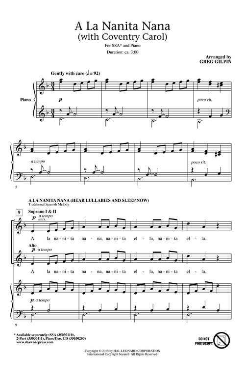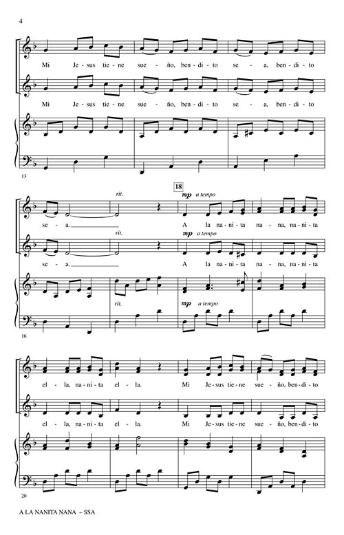 A la Nanita Nana and Coventry Carol sing one after another in this gentle choral setting. The piano rocks sweetly below the lilting text, creating a unique pairing of the familiar carols. A quiet and tender selection with lyrical lines and conservative ranges, this is a great training piece for choral singers that will also be a lovely addition to your holiday concert.
