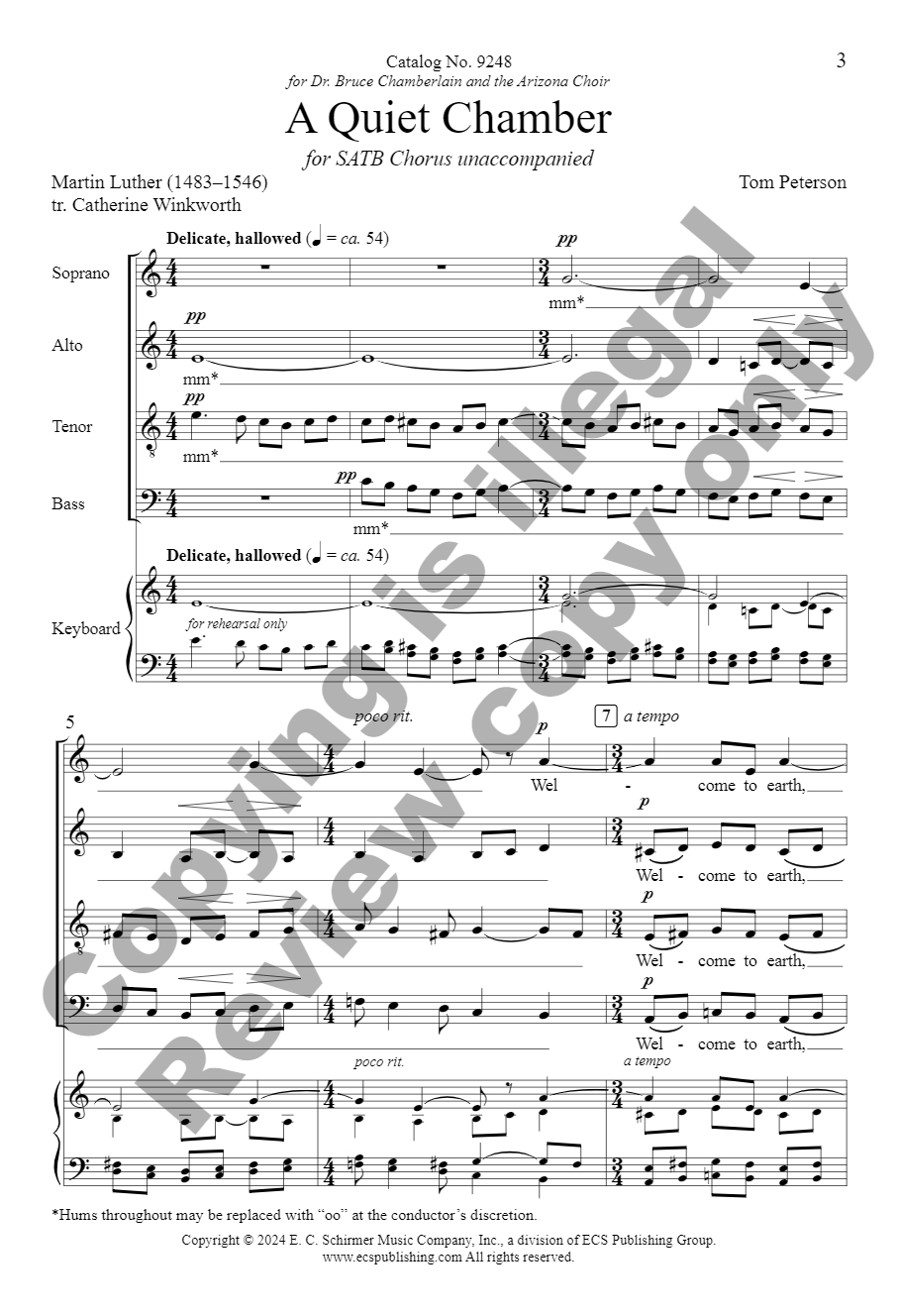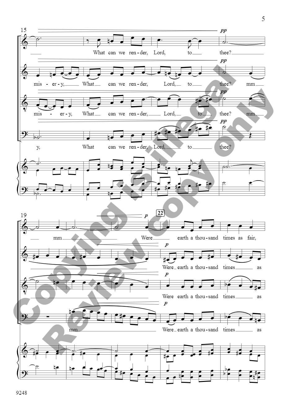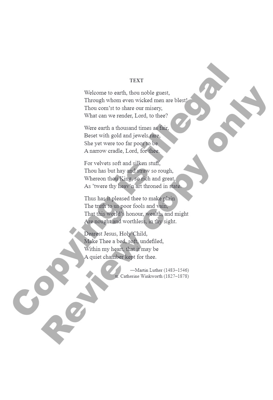 Employing sophisticated compositional techniques, this piece draws on a text by Martin Luther welcoming the Christ child into the world. Asking what we mere mortals can bring the Savior of the world, the music ebbs and flows through angular planing and sinuous chromaticism representing our humble humanity and the everlasting grace of Christ, ending in a tender invitation into our hearts: “a quiet chamber kept for thee.” For advanced choirs.