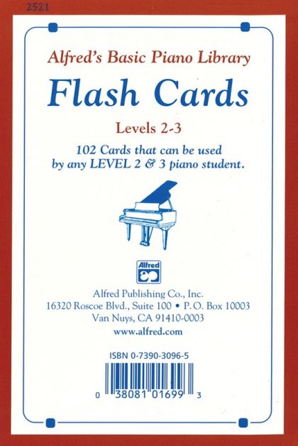102 cards are included in this set, and are coordinated page-by-page with Alfred’s Basic Piano Course Lesson Book levels 2 & 3. However, students can use these versatile learning tools with any music method. The set includes cards for the study of note recognition, note and rest values, intervals, scales, keys and key signatures, chords, extended positions, tempo marks, dynamics, time signatures, pedal, and musical terms.