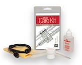 Kit includes: treated polish cloth, valve oil, tuning slide grease, vinyl cleaning snake, brass mouthpiece brush, and valve casing brush.