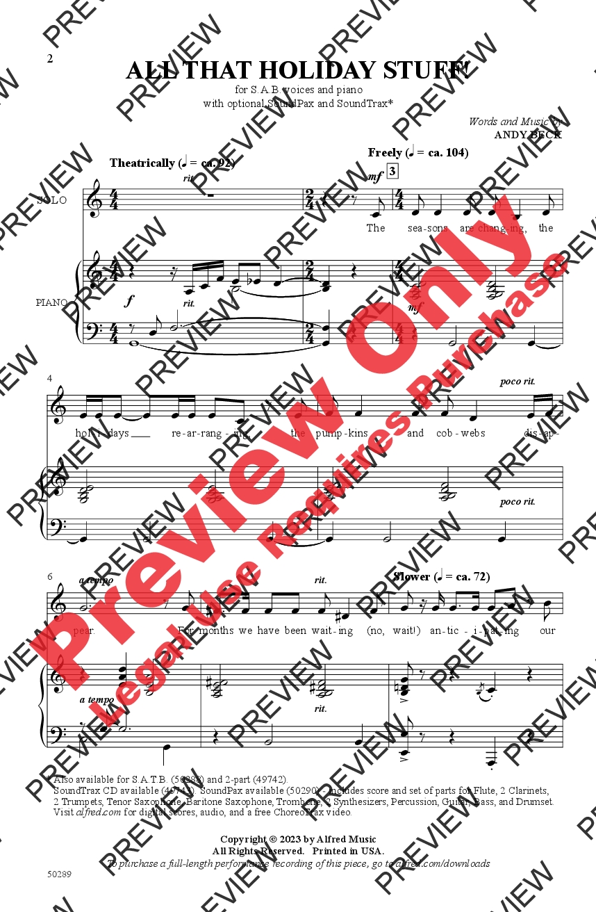 An opening solo sets the stage for what unfurls into a pizzazzy listicle of holiday decorations, characters, treats, attire . . . stuff! Andy's musical theater style shines from the moment the curtain parts to the final kickline. This holiday showstopper that craves choreography, so check out the free ChoreoTrax or design your own razzmatazz routine. A sparkling, twinkling gem of jolly that pulls out all the stops!