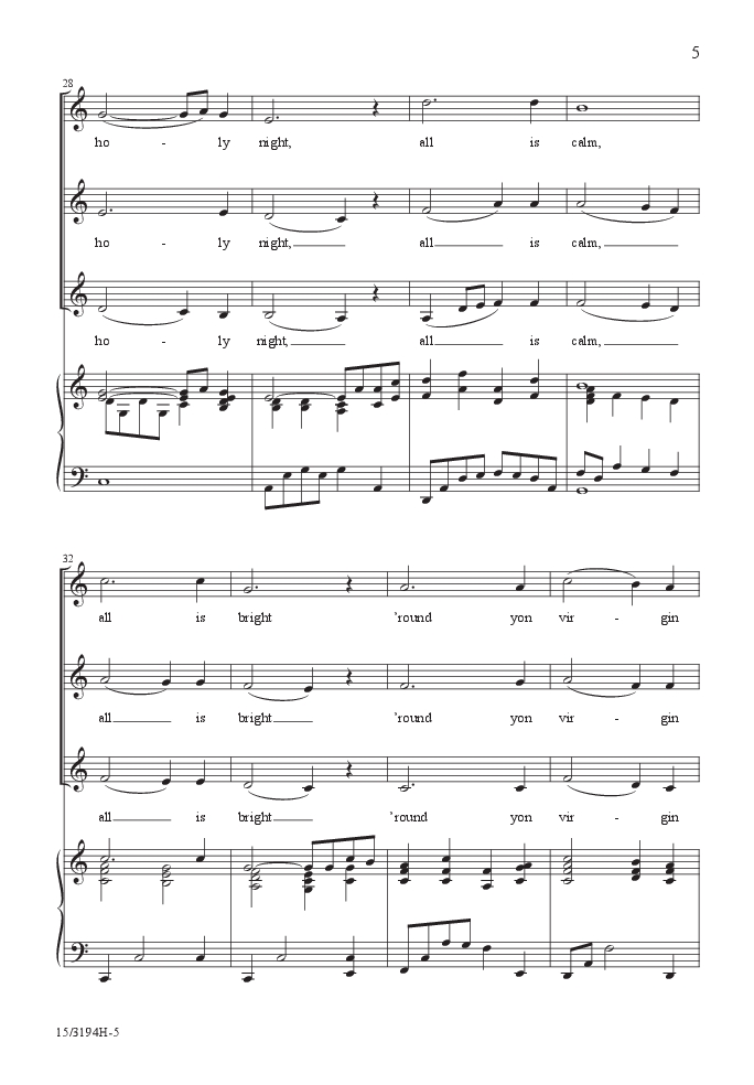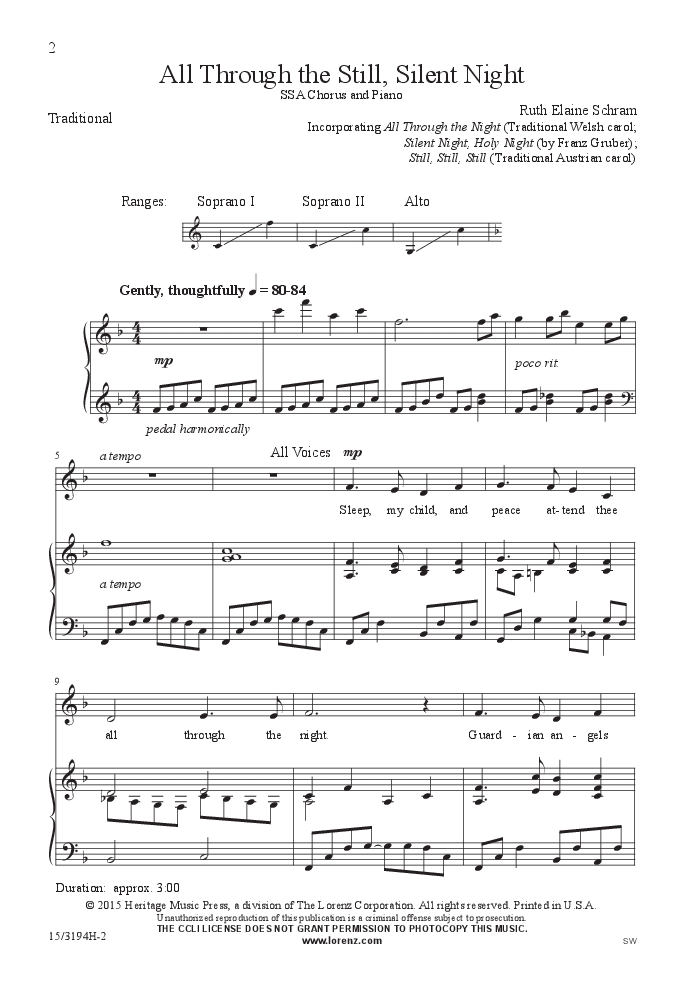 In the style of a tender lullaby, Ruthie intertwines “All Through the Silent Night,” “Silent Night, Holy, Night,” and “Still, Still, Still” to create a musical blanket of peace. Accessible and effective, this lyrical gem will highlight the musicality of your women’s choir.
