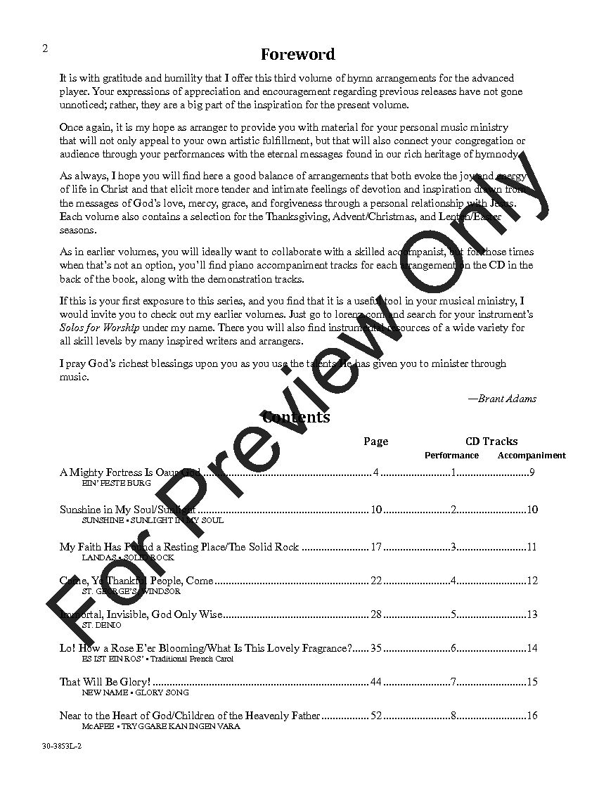 Brant Adams is perhaps the premier orchestrator for church music publishers today. This volume for alto saxophone continues the Brant Adams Instrumental Series, and includes a Performance/Accompaniment CD. These arrangements reflect his solid understanding of the individual instruments, creative arranging abilities, and a keen awareness of the local church setting shaped by his many years as a practicing church musician.