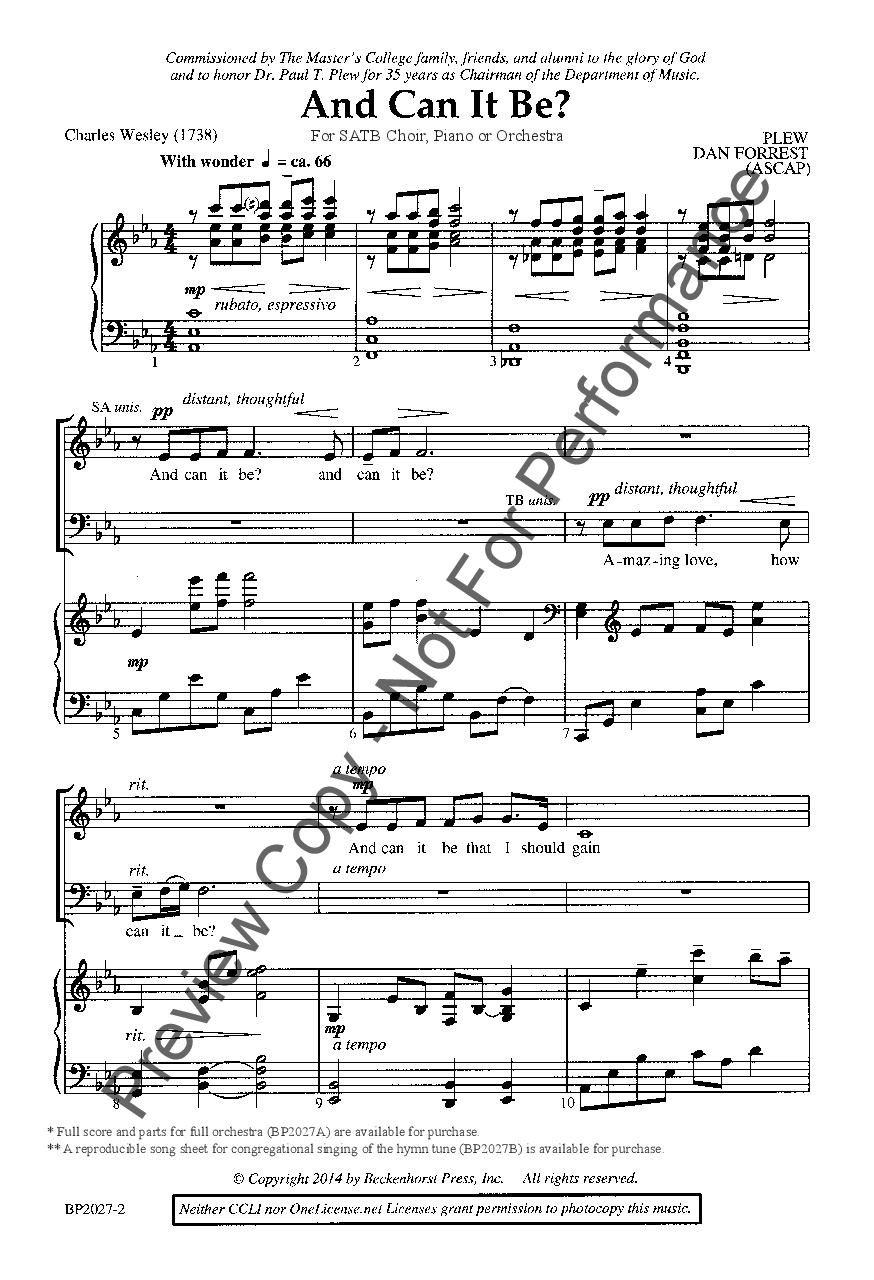 And Can it Be? is a contemplative new setting of the recognized text for SATB choir and piano. Arranged by Dan Forrest it has a quiet introspective opening that grows steadily to a bold stating of the truth of the gospel, ending with a thoughtful reiteration of the question and the assurance of the breathtaking love.