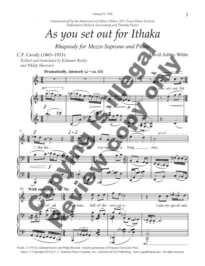 As you set out for Ithaka is a rhapsody, or extended piece, held together by recurring musical ideas. While the poet may be addressing a certain person, perhaps someone from Greek mythology, he might also be wishing any traveler well, hoping as he states, that the “voyage is a long one, full of adventure, full of discovery.” Without question, the traveler should expect a journey replete with exoticism, a degree of danger, and great beauty.