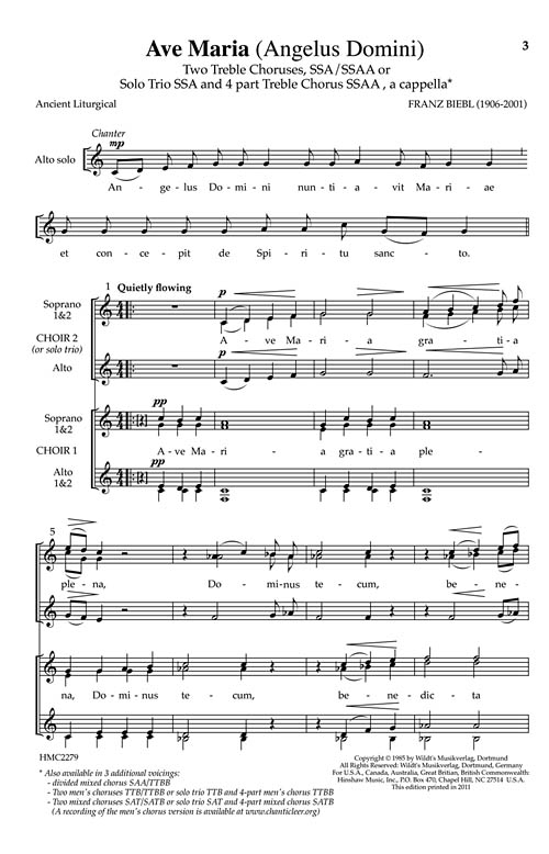 Ave Maria by Franz Biebl is a motet composed for double choir, a large four-part choir and a three-part choir which can be performed by soloists. It is a setting of part of the Latin liturgical Angelus prayer, which contains the Ave Maria (Hail Mary) as a refrain. The composition was originally written for men's chorus, but the composer wrote arrangements for mixed choir and women's choir.