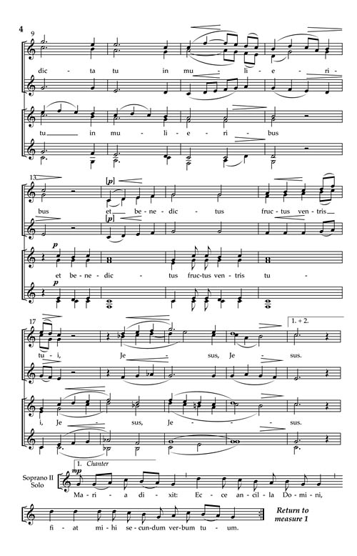 The text is the beginning of the Latin Catholic liturgical Angelus prayer, three verses based on biblical sources, with the Ave Maria as a refrain. In Biebl's setting, the Ave Maria refrain contains only the first half of the Ave Maria prayer, the benediction of Mary and the fruit of her womb, Jesus. The second half, praying for Mary's intercession, is delivered as a conclusion, deviating slightly from the liturgical text by addressing Mary as Holy Mother twice, asking firstly for intercession with “us sinners”, and secondly for “in the hour of our death”, while the Ave Maria prayer combines both requests in one. The prayer is closed by Amen.