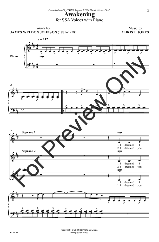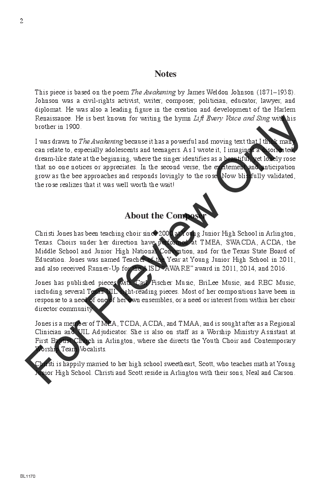 Based on the inspirational poem by civil rights advocate James Weldon Johnson, this selection features beautiful cluster chords over a driving syncopation that your choirs will love. With a mature quality that is not too difficult to achieve, this piece will certainly empower your singers!