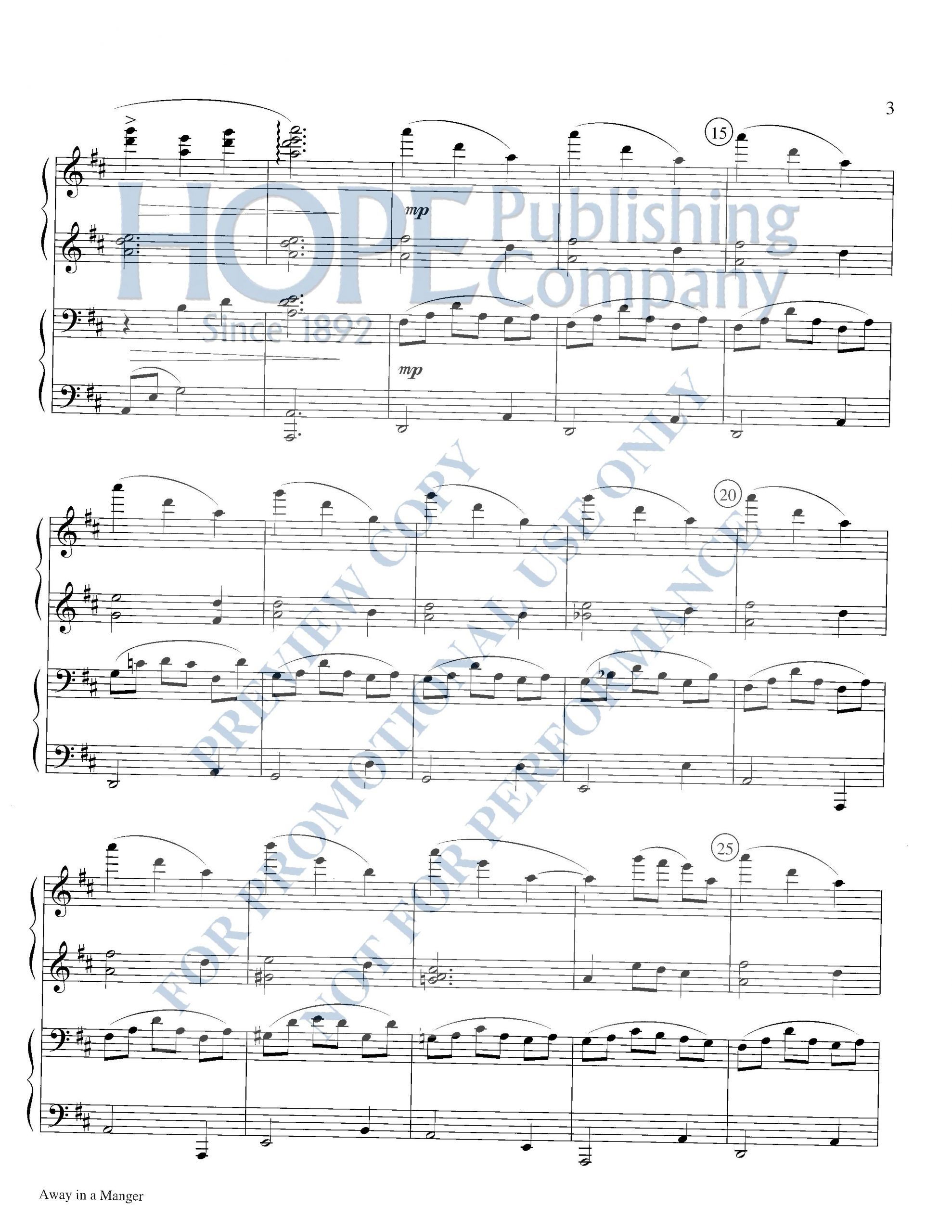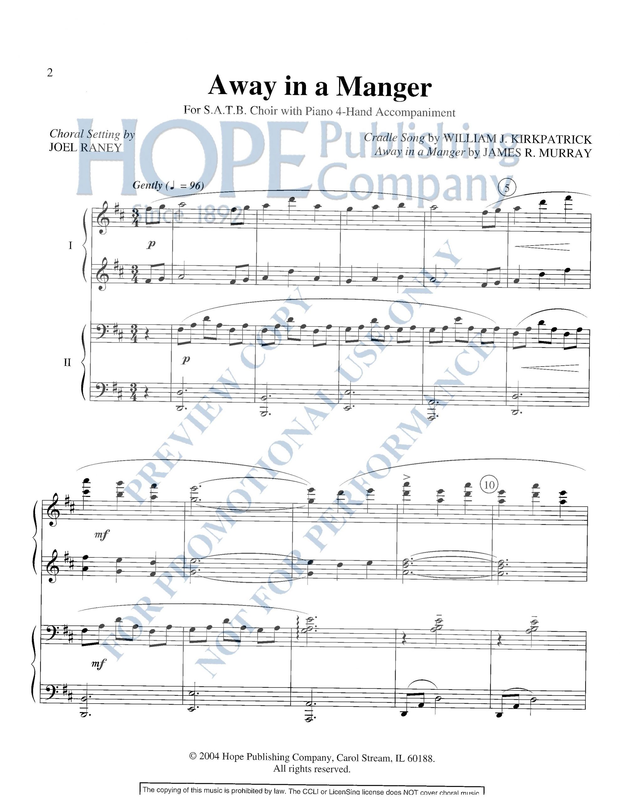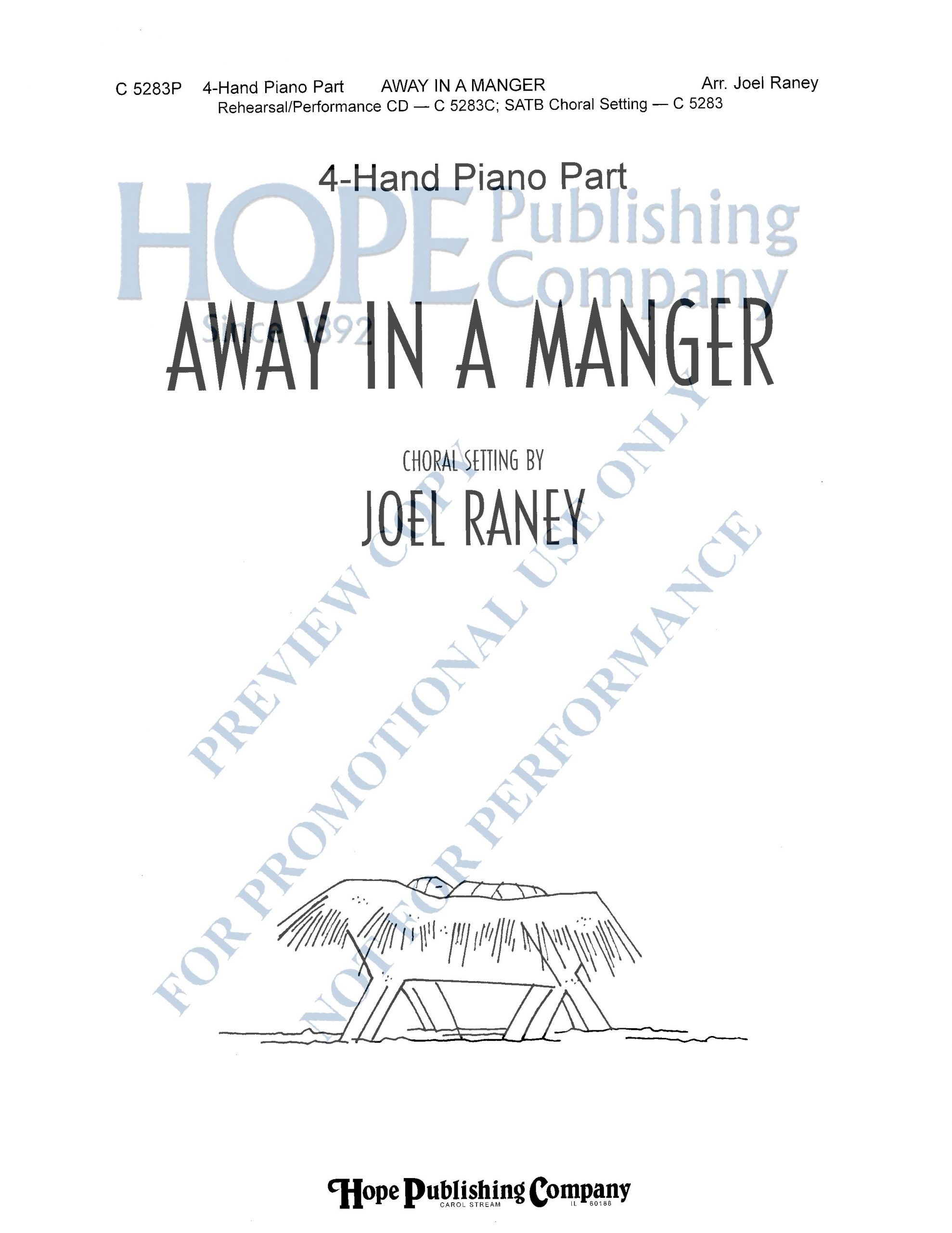 In the same vein as Joel Raney's 2003, top-selling setting of “Gentle Mary Laid Her Child,” here is a Christmas lullaby with optional four-hand piano accompaniment. The two tunes, Cradle Songs and Away in a Manger, are woven together with lush harmonies that grow to a grand point of intensity and then end in quiet, earnest prayer.