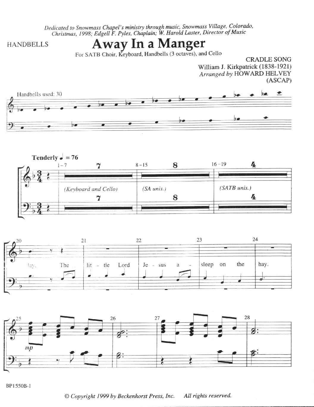 The combination of handbells, cello, flowing keyboard accompaniment and seamless vocal writing creates a mood that takes this simple carol to a new level of sophistication. Mr. Helvey's layering of the two tunes, CRADLE SONG and AWAY IN A MANGER, is the crowning glory of this exquisite arrangement.