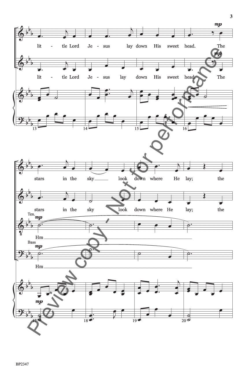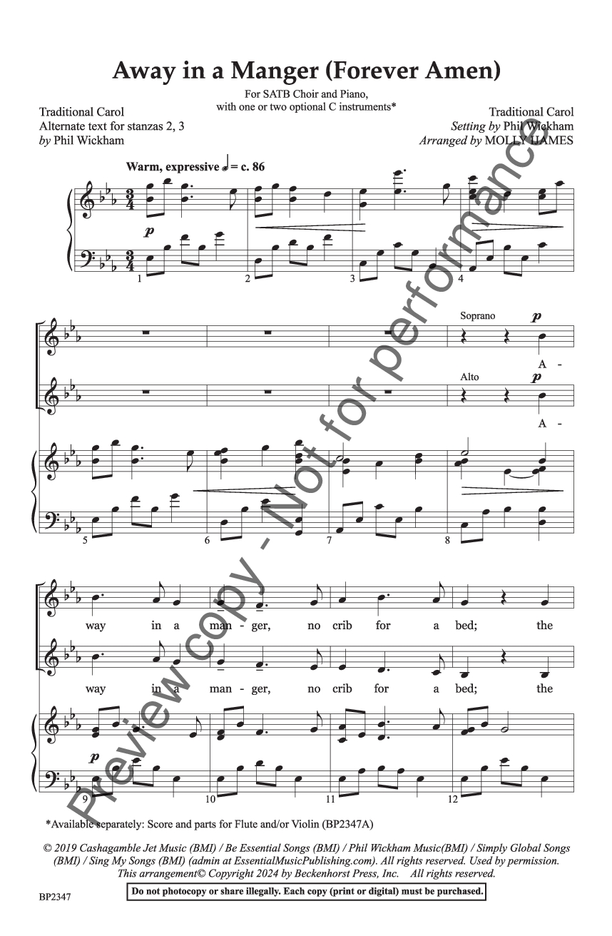 Phil Wickham's tender setting of this carol is arranged here for choir by Molly Ijames. A gentle instrumental motif unifies the steady growth between stanzas, and optional alternate lyrics for stanzas 2-3 provide an opportunity for an even richer worship moment. Add the optional 1-2 C instruments for more color and impact.