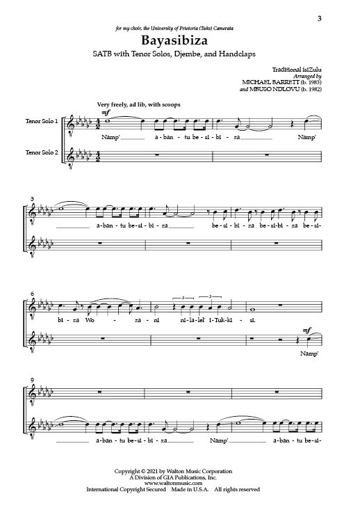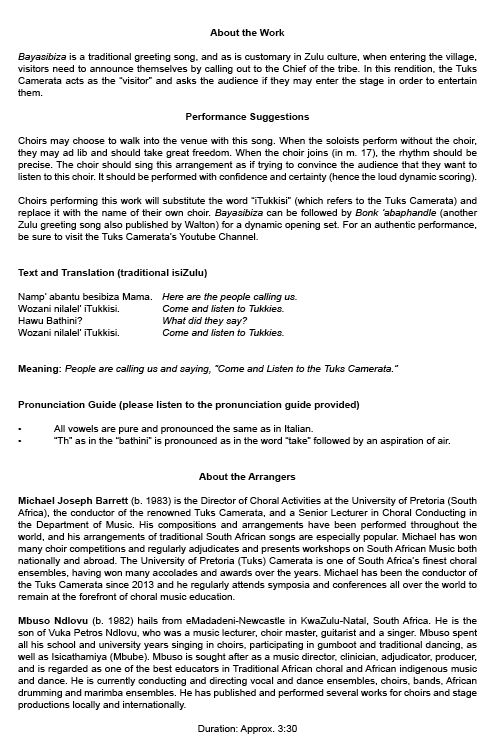 This tremendous work from Michael Barrett and Mbuso Ndlovu will make a fantastic concert opener! A dramatic opening is followed by an up-tempo traditional-style arrangement with percussion. Use this piece for your concert or festival for great impact!