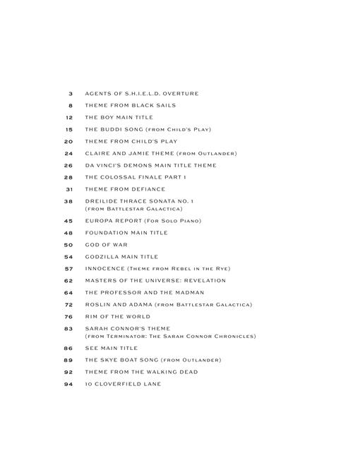 This sheet music collection includes 24 film, television, and gaming themes by composer Bear McCreary, all arranged for solo piano.