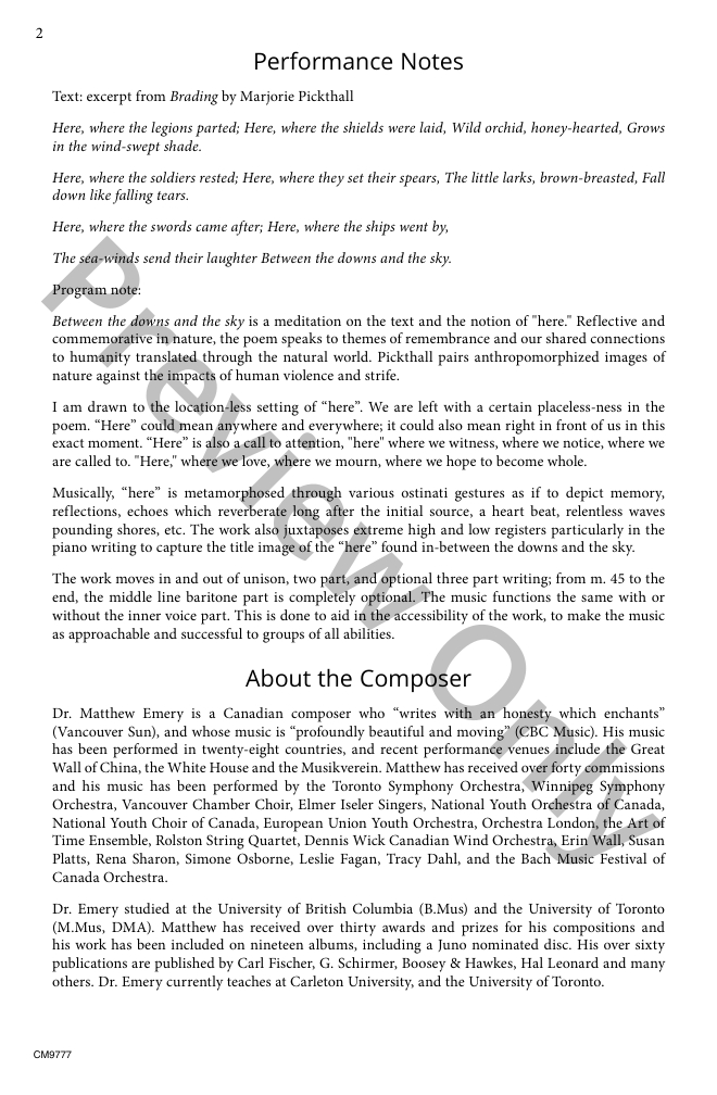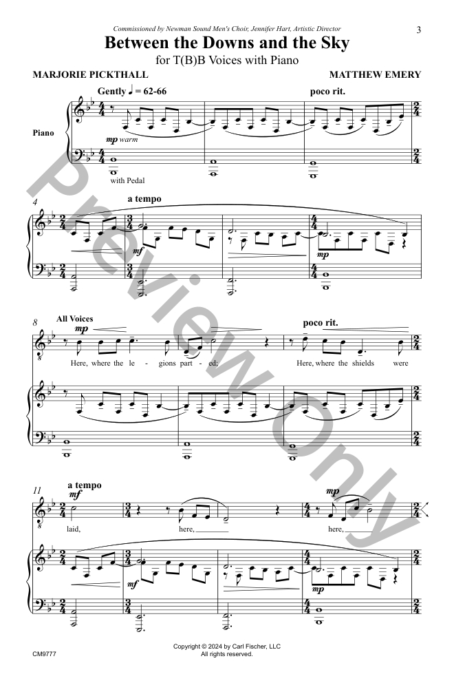 Reflective and commemorative in nature, the text of Between the Downs and the Sky speaks to themes of remembrance and our shared connections to humanity. Emery's expansive writing moves in and out of unison, two part, and optional three parts, aiding in the accessibility of the work for TB ensembles of all sizes and abilities.