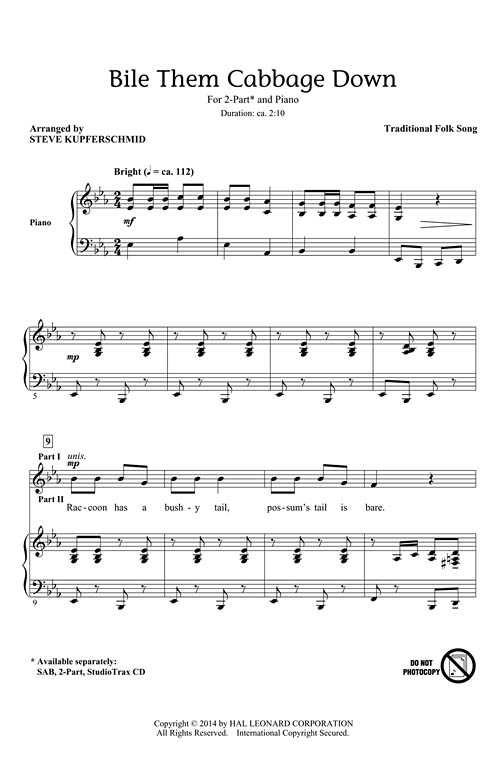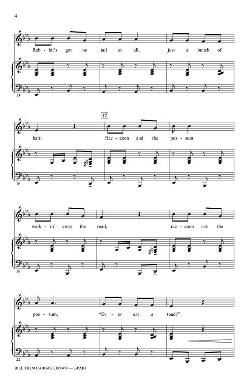This lively, rhythmic, and humorous arrangement is pure fun from start to finish, not to mention easy to learn! Hand-clappin', hootin' and hollerin', and even some barking and howling fill the verses and choruses key change after key change. Add some foot-stompin' and a fiddle and you're ready to “bile them cabbage down!”