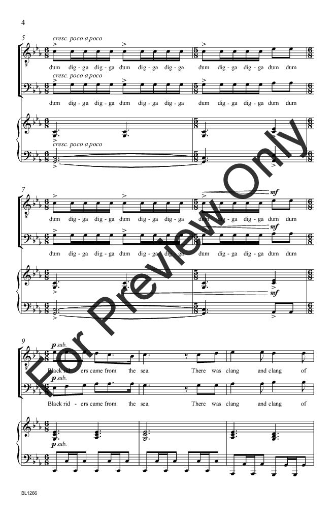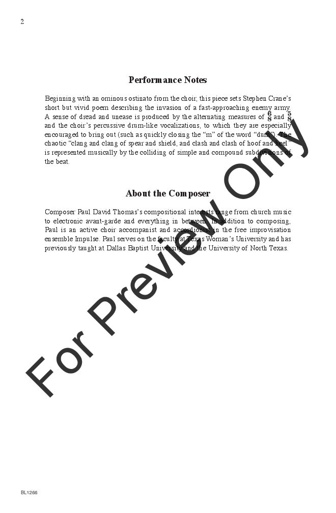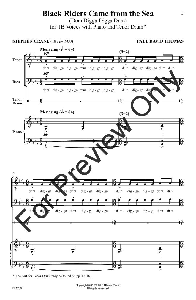 Beginning with an ominous ostinato from the choir, “dum digga digga dum,” this piece sets Stephen Crane's short but vivid poem describing the invasion of a fast-approaching enemy army. An engaging concert work for developing tenor-bass or treble choirs that they're sure to like! Who doesn't like to sing “dum digga digga dum”?