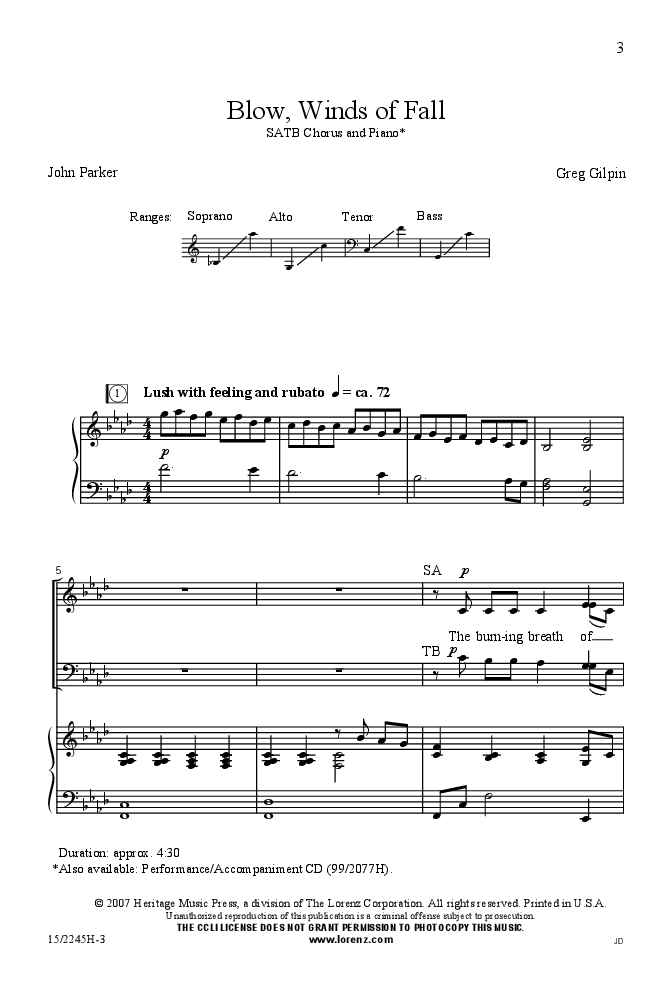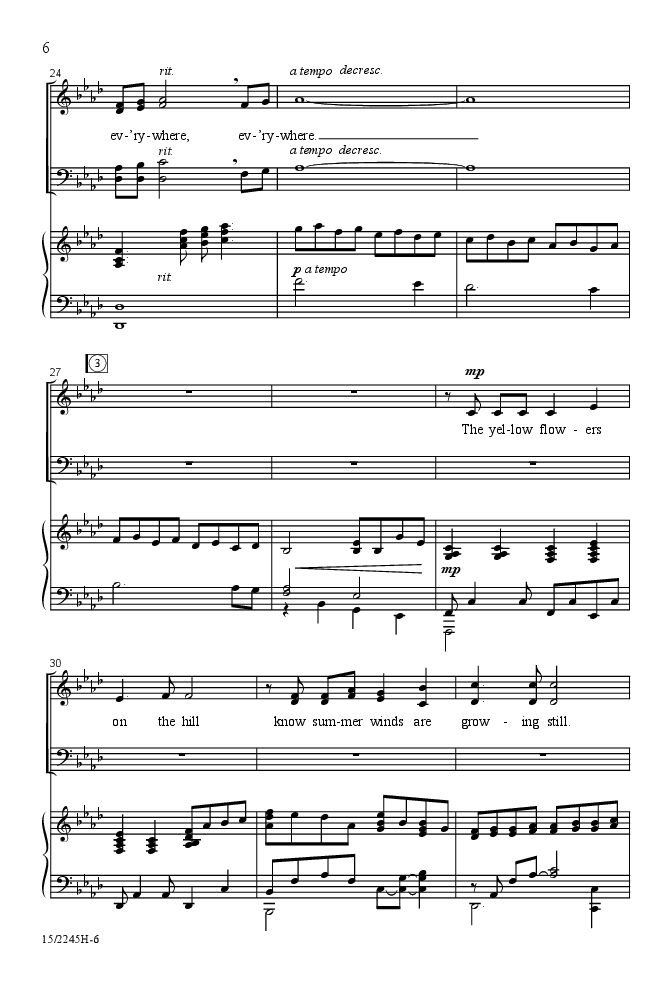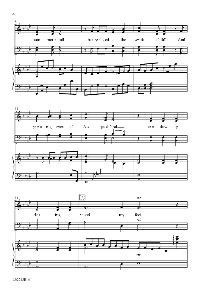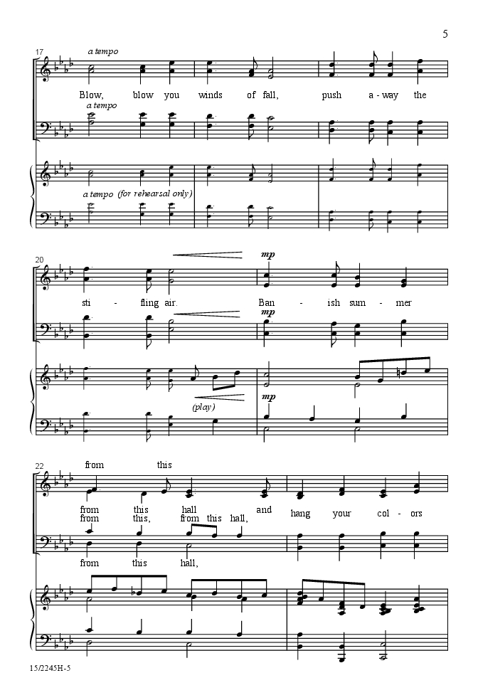 Vivid imagery depicting the change of seasons is portrayed in this gorgeous piece, painted with beauty and simplicity. From its hushed opening, it builds to full choral sonorities, tapering to an ending of quiet splendor.