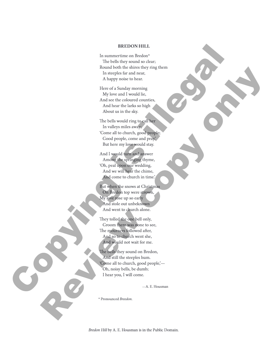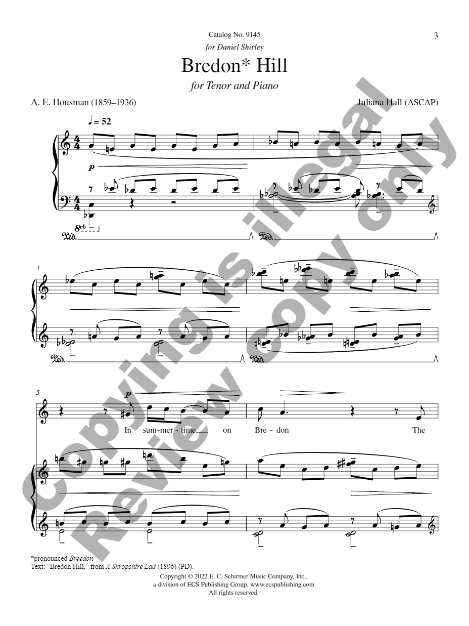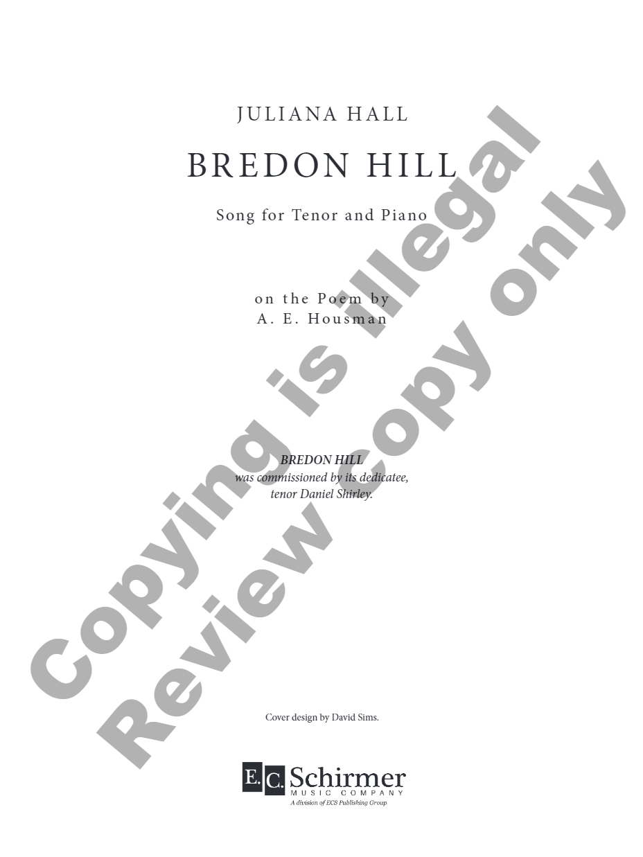 Juliana Hall’s song setting of A. E. Housman’s evocative poem Bredon Hill is part of tenor Daniel Shirley’s multi-year commissioning and recording project called “New Songs from Shropshire” consisting of new art songs for tenor and piano on the poetry of A. E. Housman (specifically ‘A Shropshire Lad’). Shirley wrote to Hall, “As you know, verses from ASL have been set by many of the prominent British composers (Somervell, Ireland, etc.), but fewer Americans. I believe that a volume of American compositions on these profound lyrics is long overdue. Importantly, I hope for the range of participating composers to reflect the diversity of America itself.” Shirley’s choice of composers certainly does just that, with contributions from composers Matt Boehler, Tom Cipullo, Scott Gendel, Juliana Hall, Edward Jacobs, Andre Myers, Mark Richardson, Daniel Bernard Roumain (DBR), Kamala Sankaram, Melissa Shiflet, Fahad Siadat, Michael Slayton, Mark Alan Taggart, and Melinda Wagner. Bredon Hill was premiered on Monday, October 4, 2021 at Eastern Carolina University by faculty tenor Daniel Shirley and faculty pianist Eric Stellrecht.