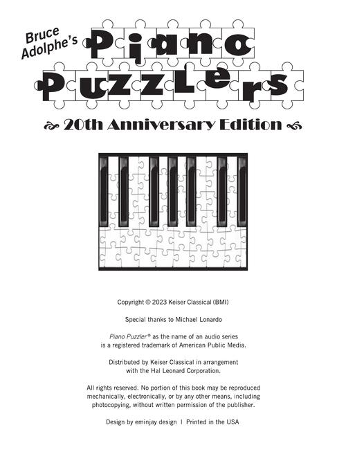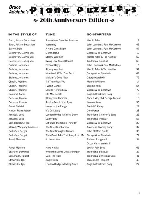 This brand-new edition of Bruce Adolphe's Piano Puzzlers celebrates the 20th anniversary of the show as heard on Public Radio's “Performance Today.” Includes 30 tunes with songs by Gershwin, Kern, Arlen, Porter, Rodgers, Lennon & McCartney, and others disguised in the styles of Bach, Haydn, Mozart, Beethoven, Brahms, Schumann, Chopin, Janácek, Debussy, Ravel, Stravinsky, Prokofiev, Bartók, Fauré, Mendelssohn, Scarlatti, and Copland. Introduction included by Fred Child, Host of American Public Media's “Performance Today.”