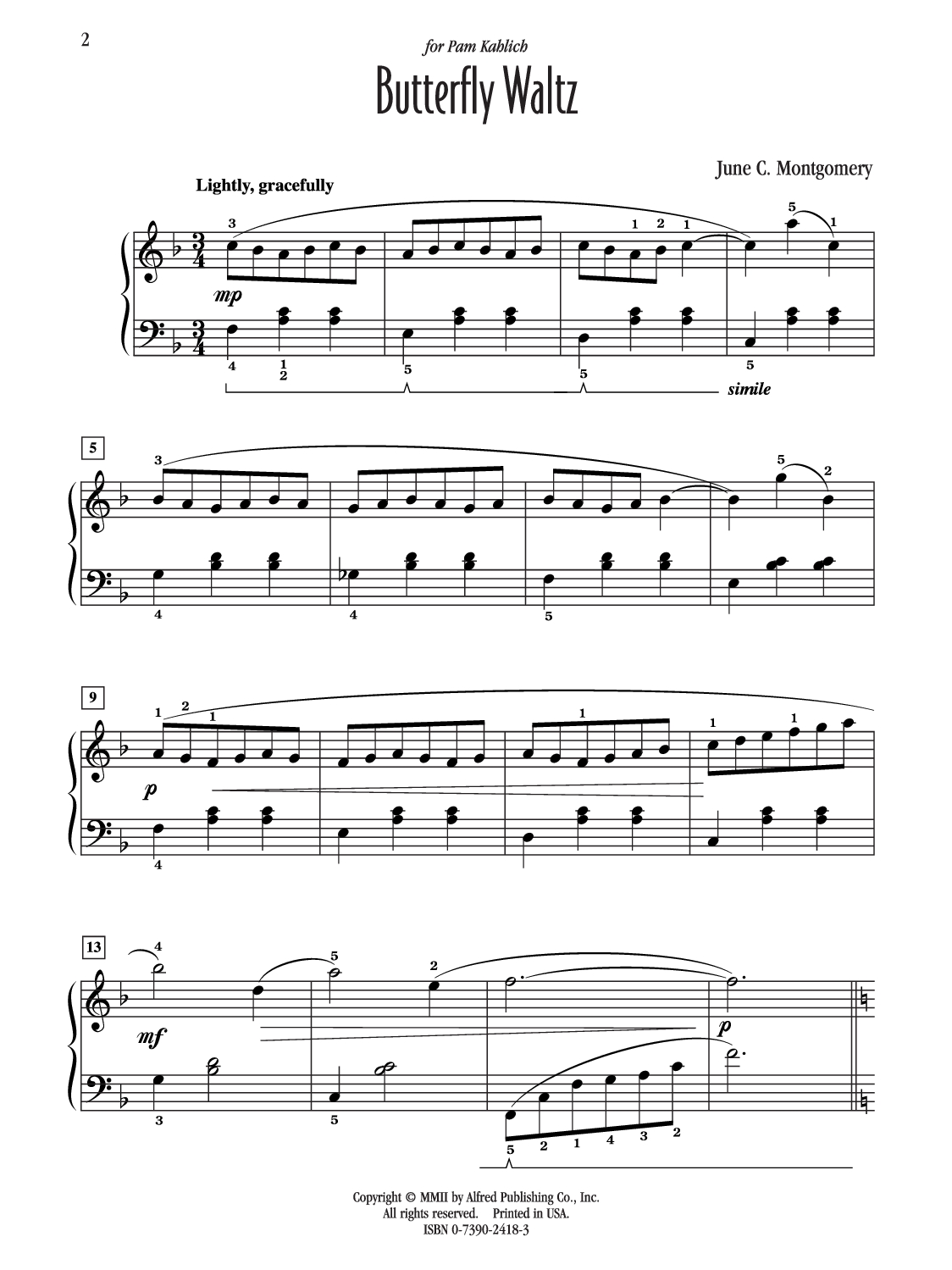 Light, graceful and lyrical playing can be reinforced with this delightful solo by June Montgomery. The A section features a left-hand descending waltz bass line with a sequential right-hand melodic line reminiscent of butterflies fluttering in the garden. The B section offers a nice contrast with a slightly faster tempo and change of key from F Major to A minor. The A section returns in the key of C making this piece a good study of major and relative minor keys.