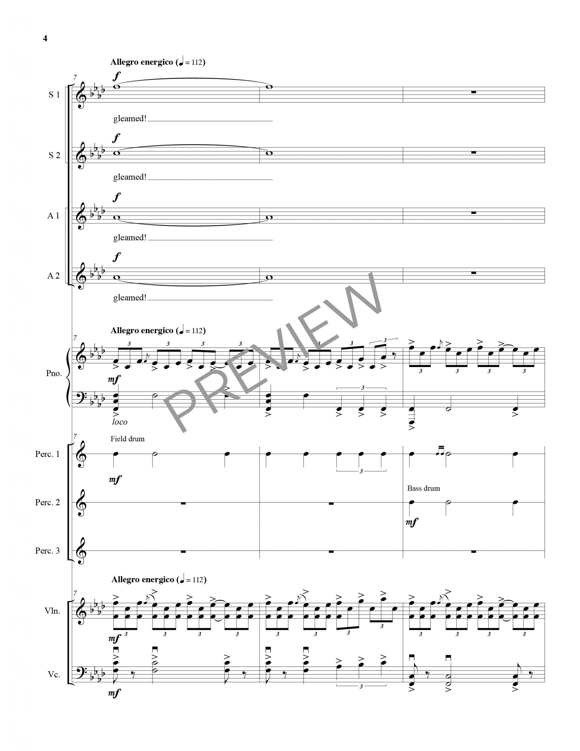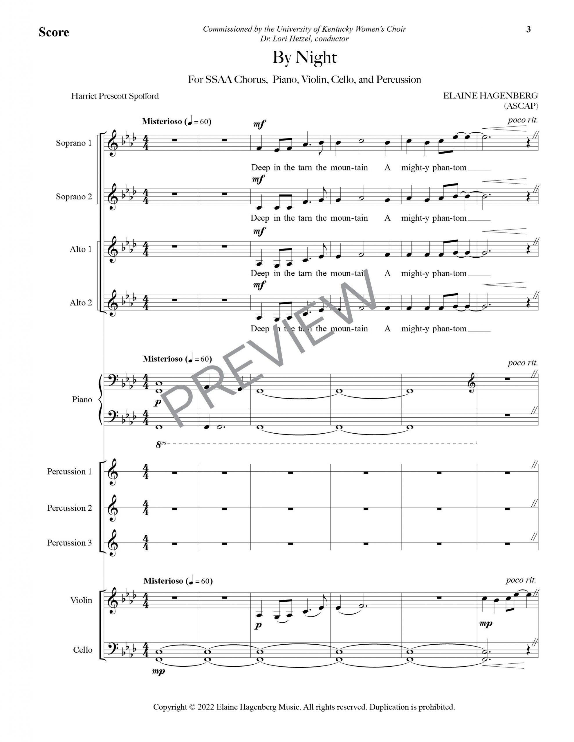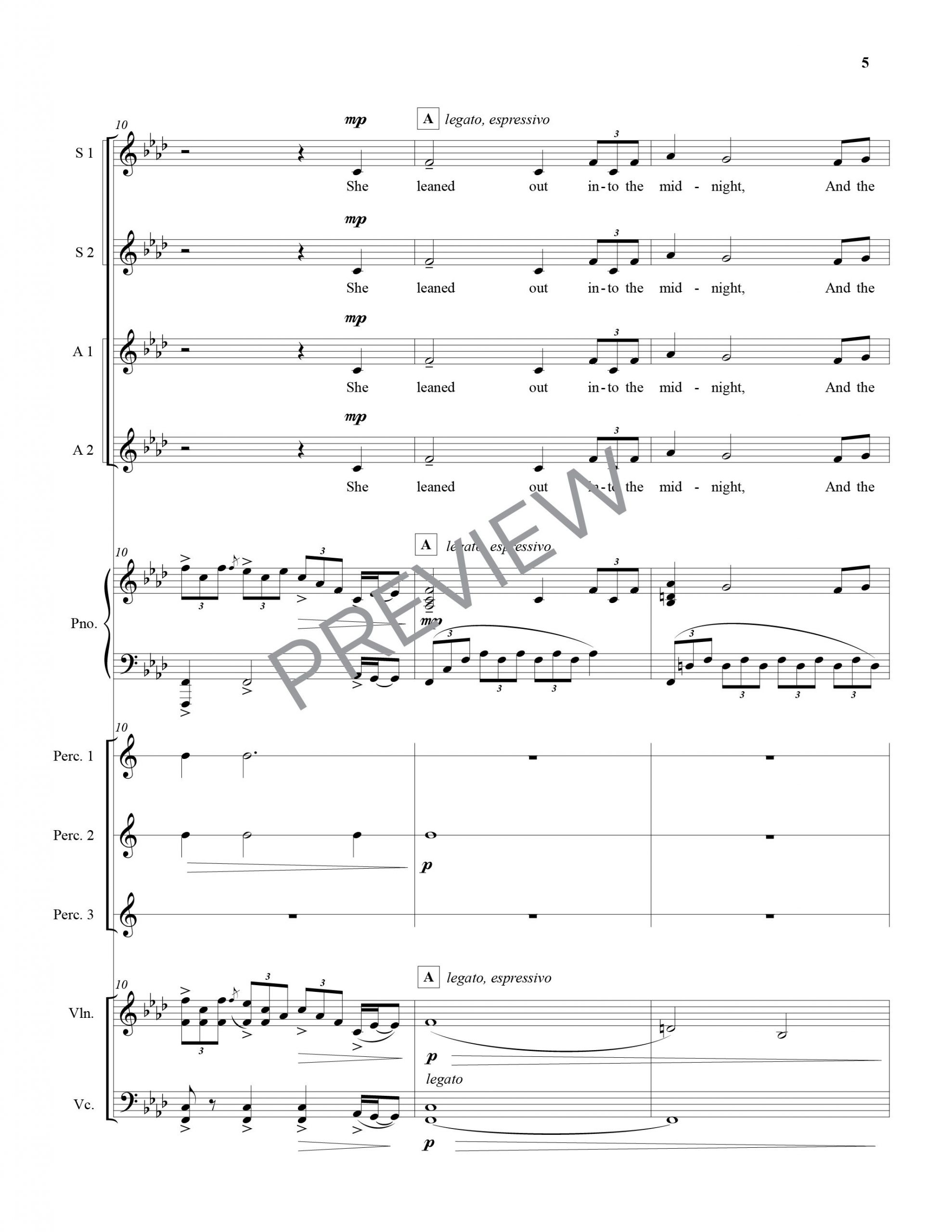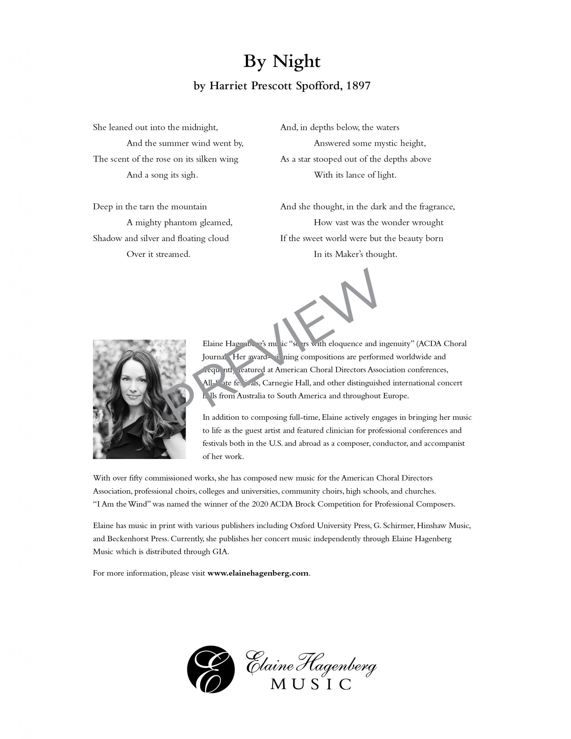 Harriet Prescott Spofford’s poem “By Night” depicts a young woman who discovers a bold new world of thrilling beauty when she ventures beyond her familiar walls. A galloping accompaniment underscores this wild discovery, and a soaring wind motif in the vocal line rushes forth as if to take the viewer's breath away. A contrasting middle section pauses briefly to meditate on the “beauty born in its Maker's thought” before racing forward again, painting a cinematic scene of wonder and awe. An exhilarating piece to close your concert program!