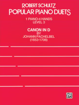 Canon in D is the most famous piece of music by Johann Pachelbel, written in or around 1680 as a piece of chamber music for three violins and basso continuo. Robert Schultz's arrangement for the intermediate pianist.