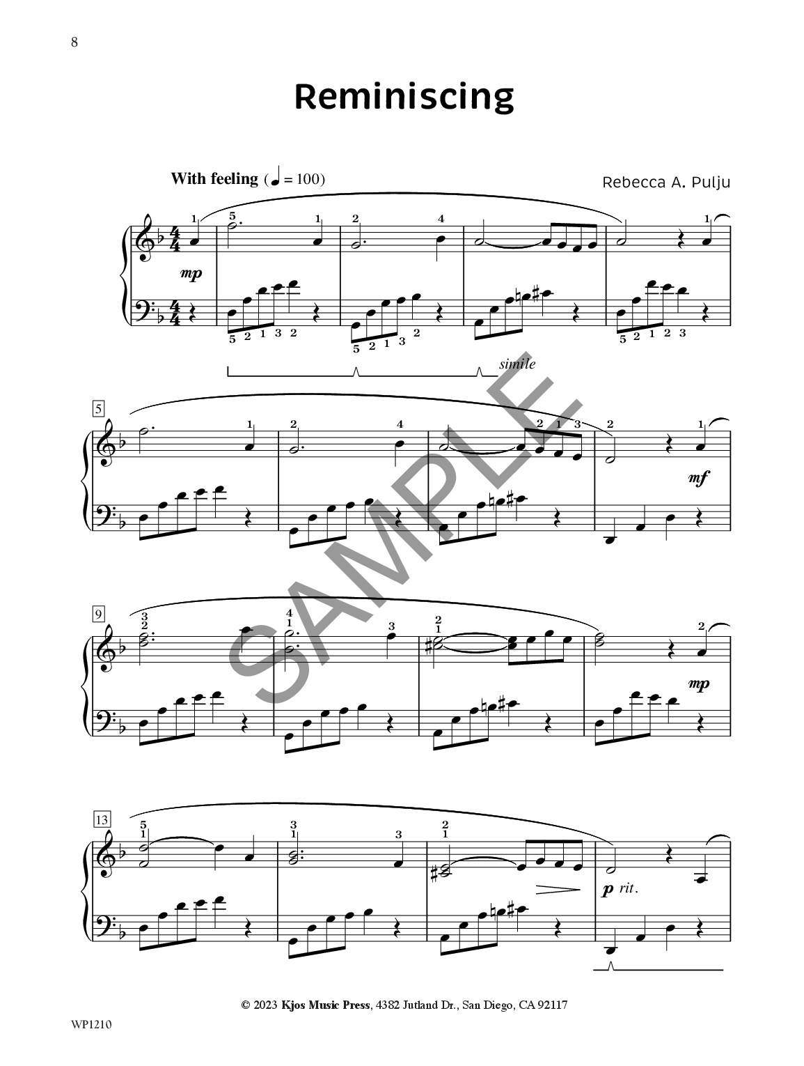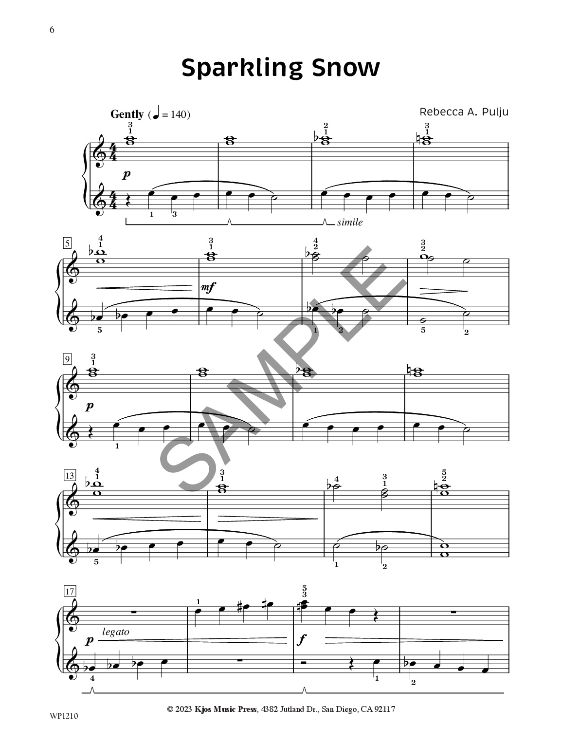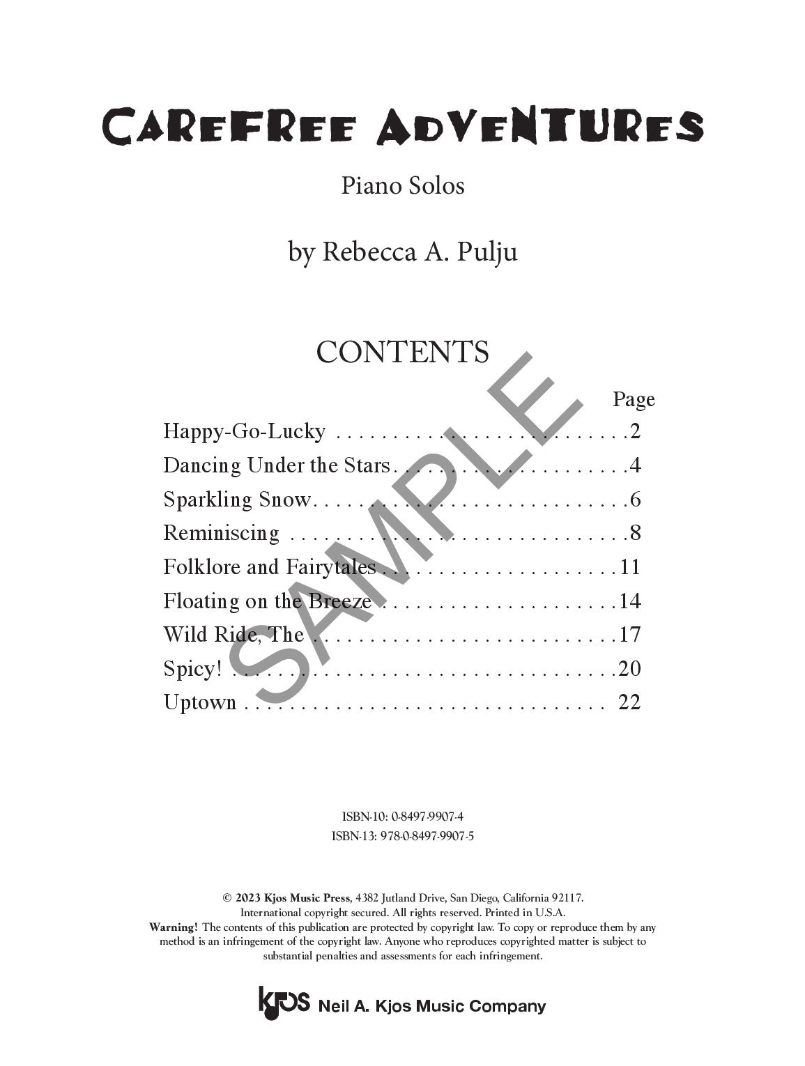 Piano students are sure to be engaged by these nine adventurous and highly diverse solos. Common meters and key signatures are included. Playful pieces in 6/8 time include Happy-Go-Lucky and Folklore and Fairytales. Two ballads (Reminiscing and Floating on the Breeze) contrast with a graceful waltz (Dancing Under the Stars) and the impressionistic Sparkling Snow. A lively show- piece (The Wild Ride) and two syncopated works reminiscent of ragtime (Spicy! and Uptown) round out this attractive set.