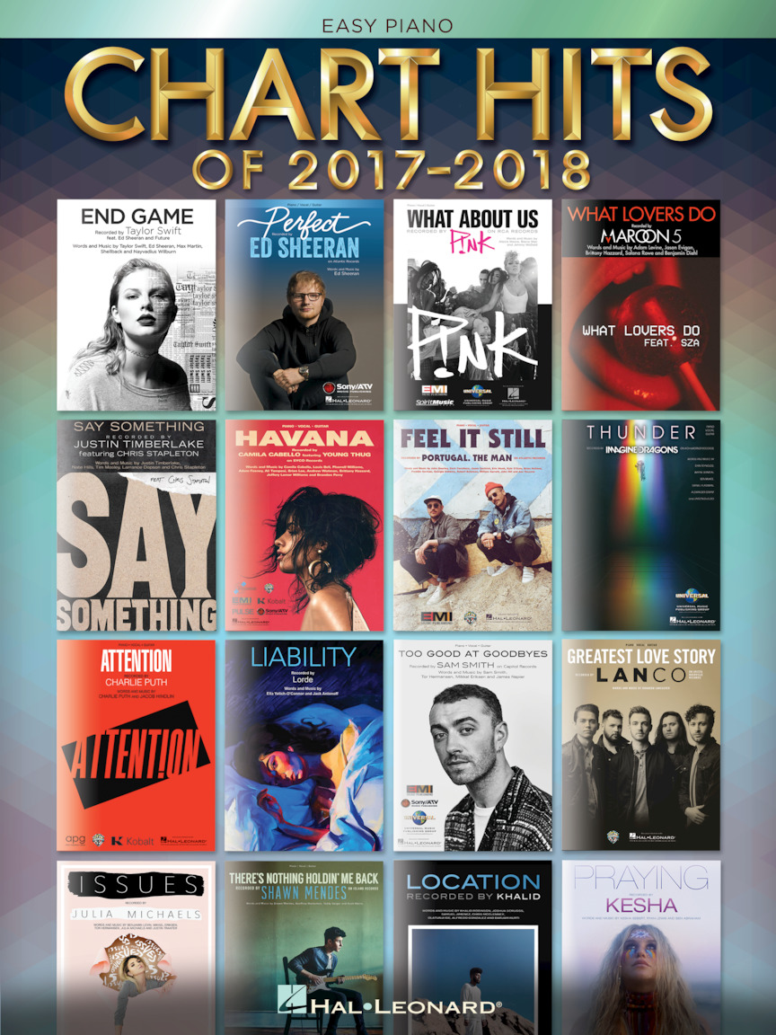 16 great hits from 2017 and 2018 are arranged here for easy piano. Includes: Attention • End Game • Feel It Still • Greatest Love Story • Havana • Issues • Liability • Location • Perfect • Praying • Say Something • There's Nothing Holdin' Me Back • Thunder • Too Good at Goodbyes • What About Us • What Lovers Do.