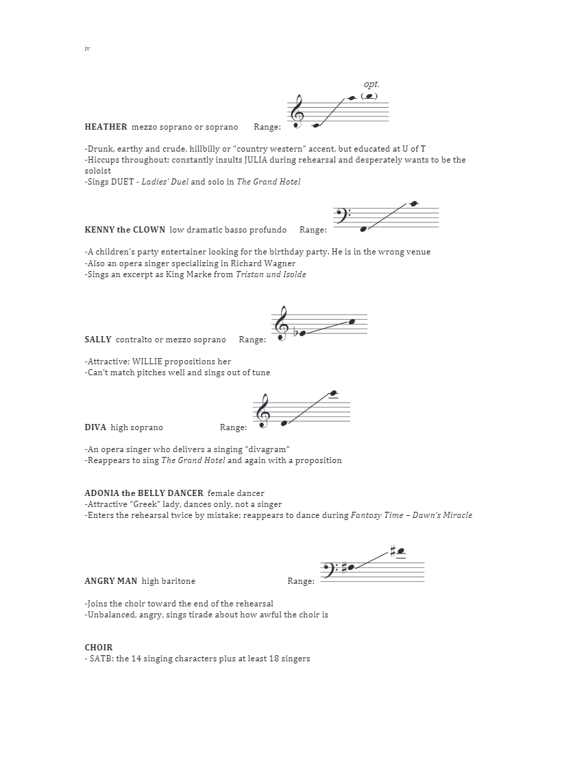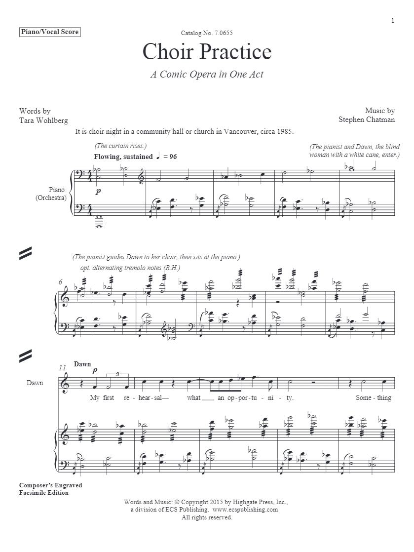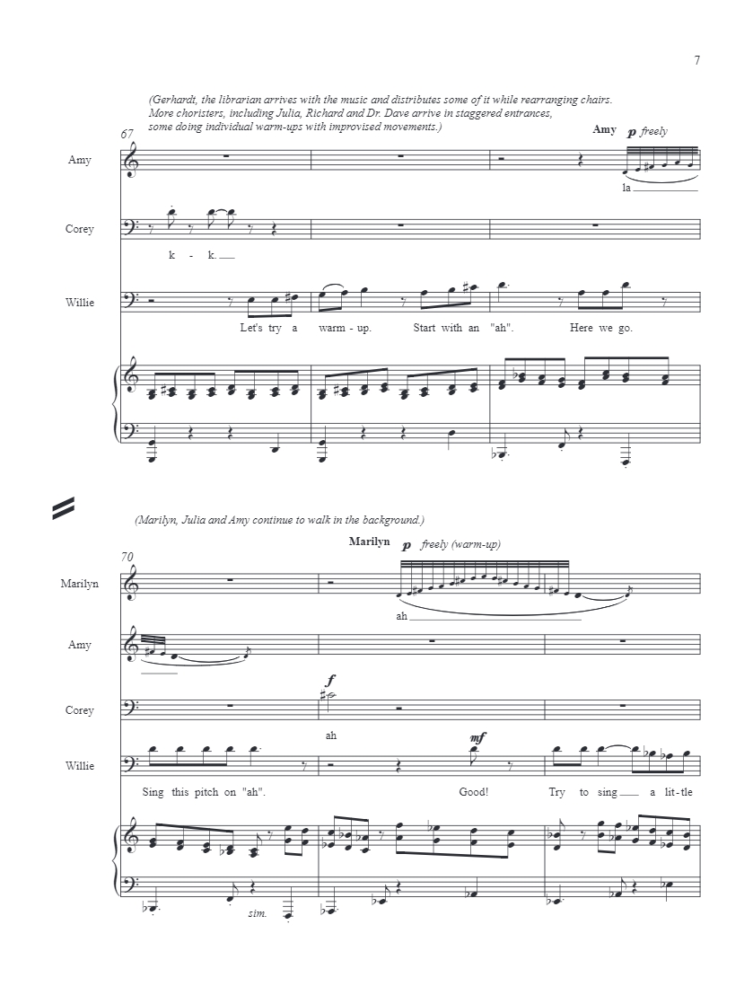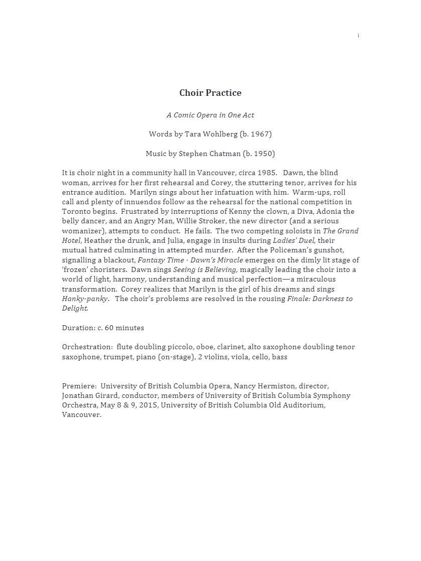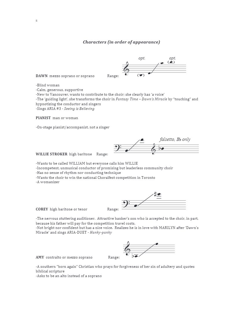 It is choir night in a community hall in Vancouver, circa 1985. Dawn, the blind woman, arrives for her first rehearsal and Corey, the stuttering tenor, arrives for his entrance audition. Marilyn sings about her infatuation with him. Warm-ups, roll call and plenty of innuendos follow as the rehearsal for the national competition in Toronto begins. Frustrated by interruptions of Kenny the clown, a Diva, Adonia the belly dancer, and an Angry Man, Willie Stroker, the new director (and a serious womanizer), attempts to conduct. He fails. The two competing soloists in The Grand Hotel, Heather the drunk, and Julia, engage in insults during Ladies' Duel, their mutual hatred culminating in attempted murder. After the Policeman's gunshot, signaling a blackout, Fantasy Time – Dawn's Miracle emerges on the dimly lit stage of 'frozen' choristers. Dawn sings Seeing is Believing, magically leading the choir into a world of light, harmony, understanding and musical perfection- a miraculous transformation. Corey realizes that Marilyn is the girl of his dreams and sings Hanky-panky. The choir's problems are resolved in the rousing Finale: Darkness to Delight.