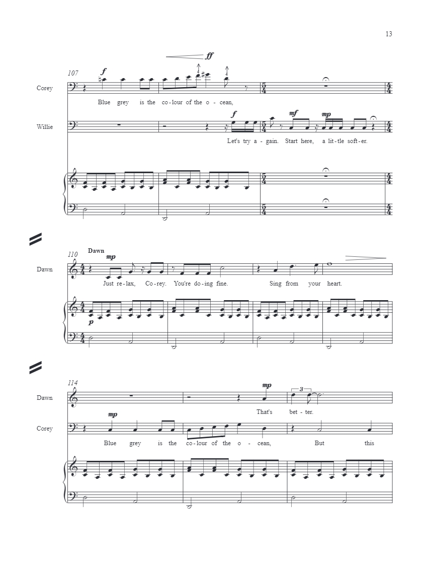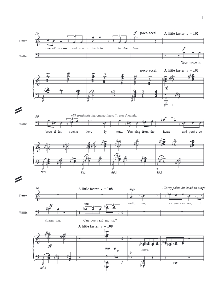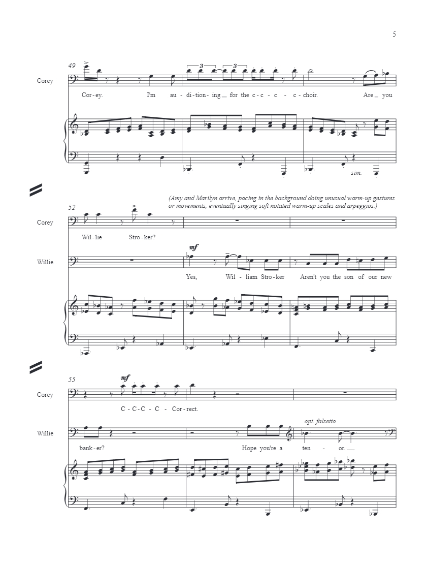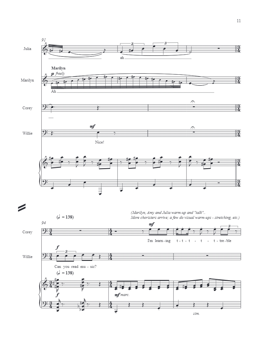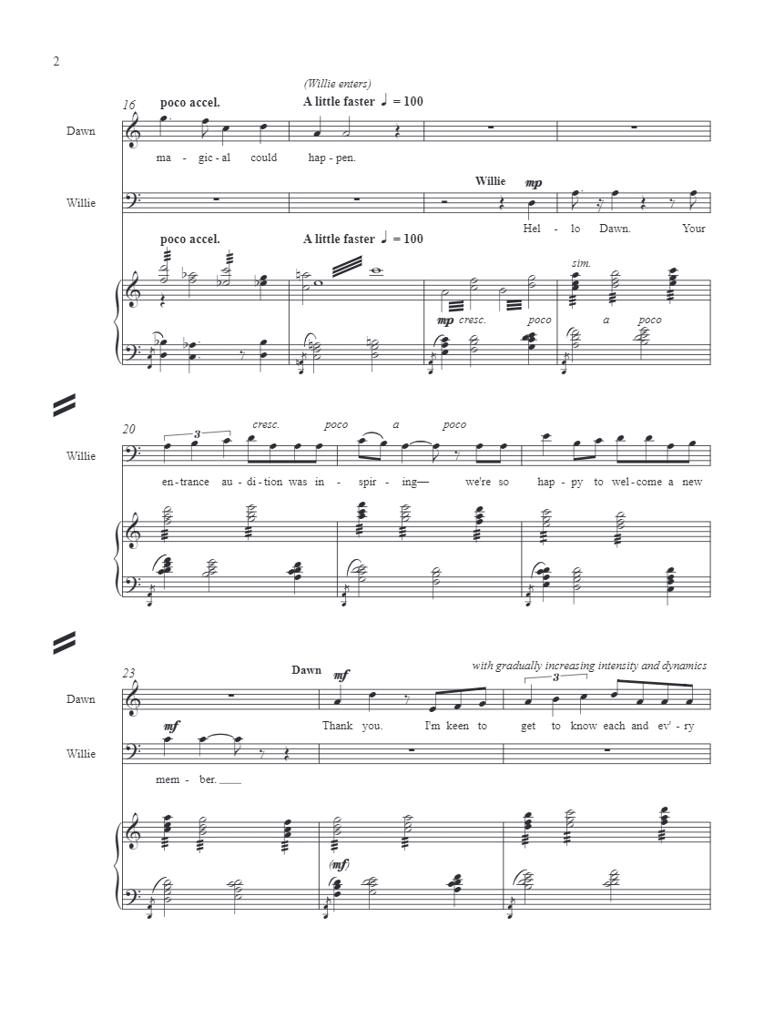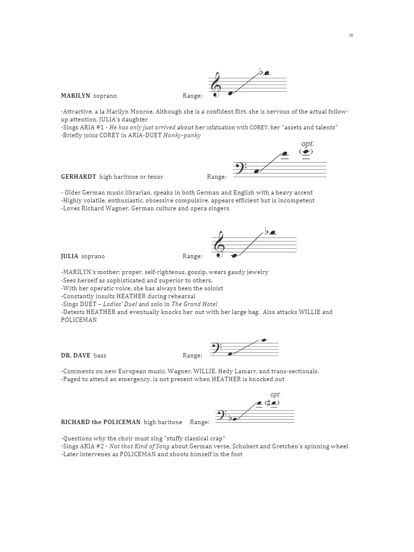 It is choir night in a community hall in Vancouver, circa 1985. Dawn, the blind woman, arrives for her first rehearsal and Corey, the stuttering tenor, arrives for his entrance audition. Marilyn sings about her infatuation with him. Warm-ups, roll call and plenty of innuendos follow as the rehearsal for the national competition in Toronto begins. Frustrated by interruptions of Kenny the clown, a Diva, Adonia the belly dancer, and an Angry Man, Willie Stroker, the new director (and a serious womanizer), attempts to conduct. He fails. The two competing soloists in The Grand Hotel, Heather the drunk, and Julia, engage in insults during Ladies' Duel, their mutual hatred culminating in attempted murder. After the Policeman's gunshot, signaling a blackout, Fantasy Time – Dawn's Miracle emerges on the dimly lit stage of 'frozen' choristers. Dawn sings Seeing is Believing, magically leading the choir into a world of light, harmony, understanding and musical perfection- a miraculous transformation. Corey realizes that Marilyn is the girl of his dreams and sings Hanky-panky. The choir's problems are resolved in the rousing Finale: Darkness to Delight.