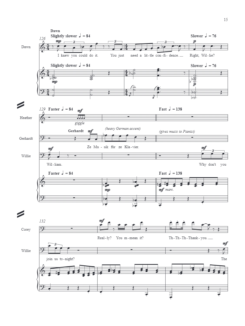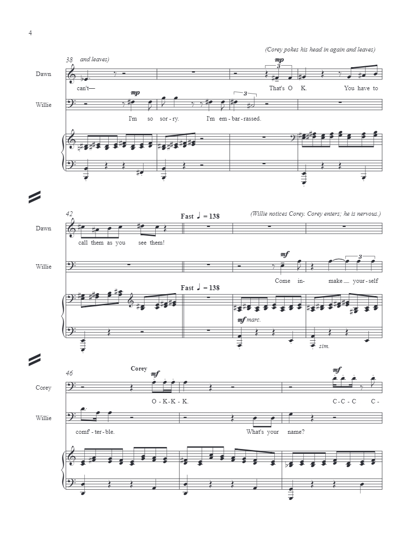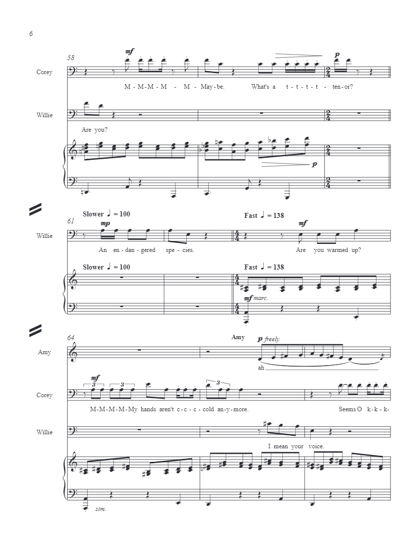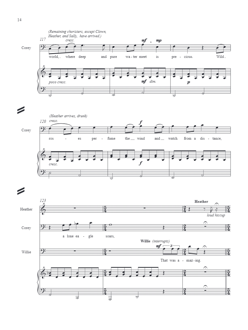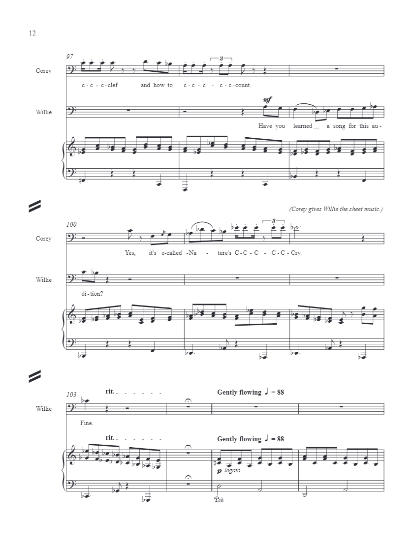 It is choir night in a community hall in Vancouver, circa 1985. Dawn, the blind woman, arrives for her first rehearsal and Corey, the stuttering tenor, arrives for his entrance audition. Marilyn sings about her infatuation with him. Warm-ups, roll call and plenty of innuendos follow as the rehearsal for the national competition in Toronto begins. Frustrated by interruptions of Kenny the clown, a Diva, Adonia the belly dancer, and an Angry Man, Willie Stroker, the new director (and a serious womanizer), attempts to conduct. He fails. The two competing soloists in The Grand Hotel, Heather the drunk, and Julia, engage in insults during Ladies' Duel, their mutual hatred culminating in attempted murder. After the Policeman's gunshot, signaling a blackout, Fantasy Time – Dawn's Miracle emerges on the dimly lit stage of 'frozen' choristers. Dawn sings Seeing is Believing, magically leading the choir into a world of light, harmony, understanding and musical perfection- a miraculous transformation. Corey realizes that Marilyn is the girl of his dreams and sings Hanky-panky. The choir's problems are resolved in the rousing Finale: Darkness to Delight.
