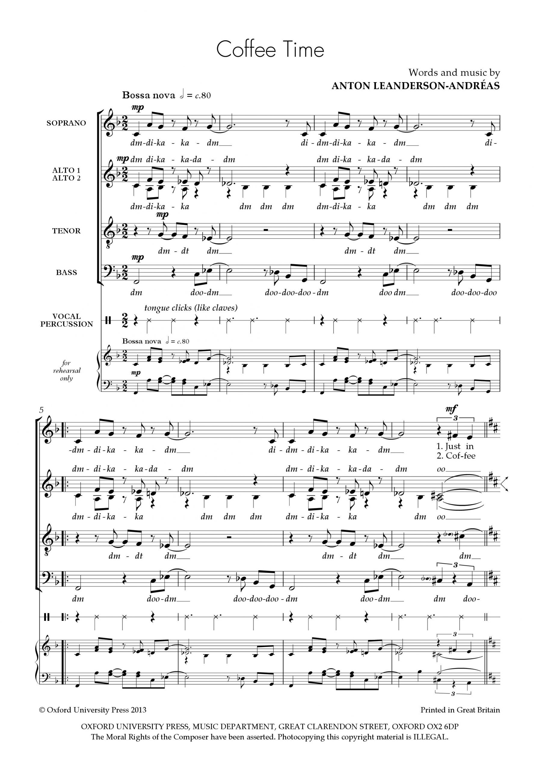 A piece made famous by the award-winning a cappella group Vocado, Coffee Time is an upbeat dedication to the down time we all crave, for sharing thoughts, silence, and that aroma! Founded on classic a cappella style and sense of fun, the piece boasts an infectious melody and bossa nova rhythm, with sumptuous key changes, scat rhythms, and contrasting sections. The piece is perfect for vocal groups or small- to medium-size choirs, and has the makings of a great encore or competition piece.