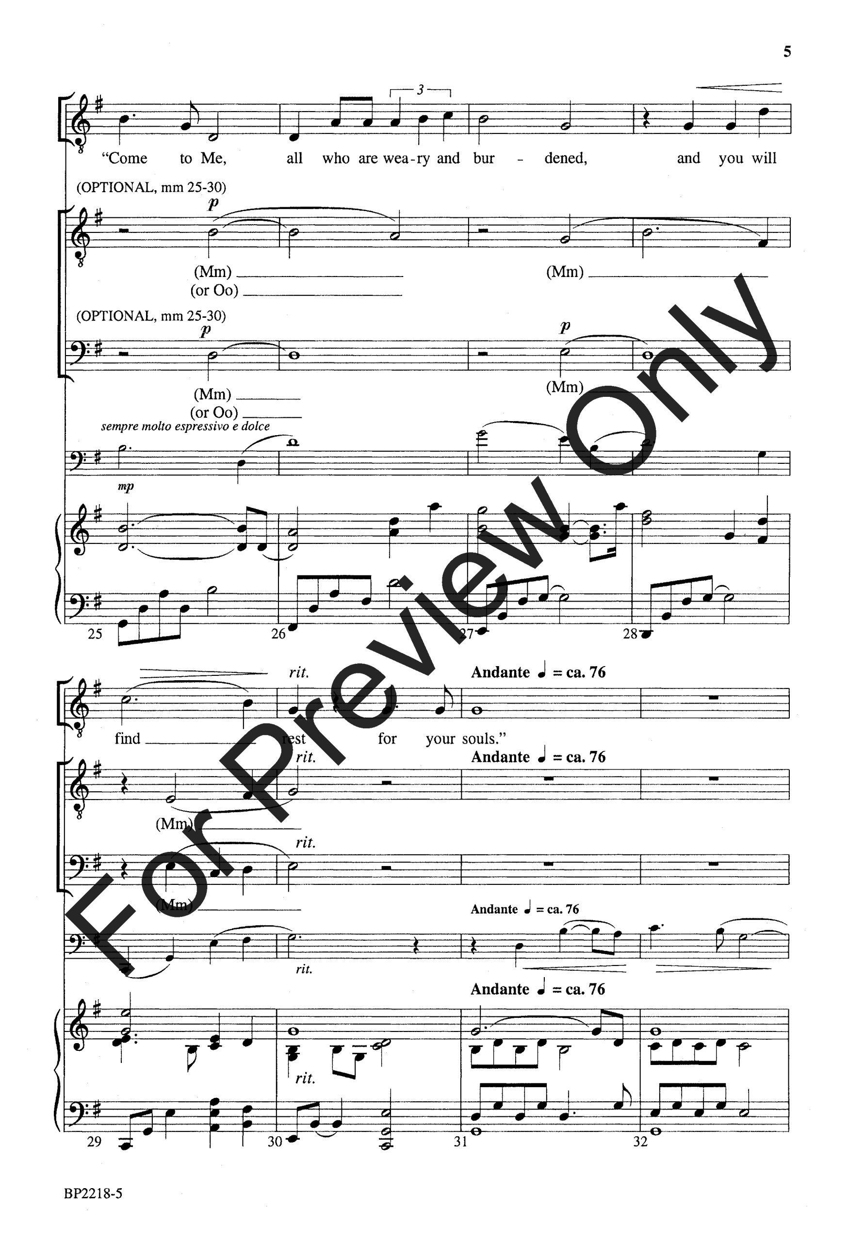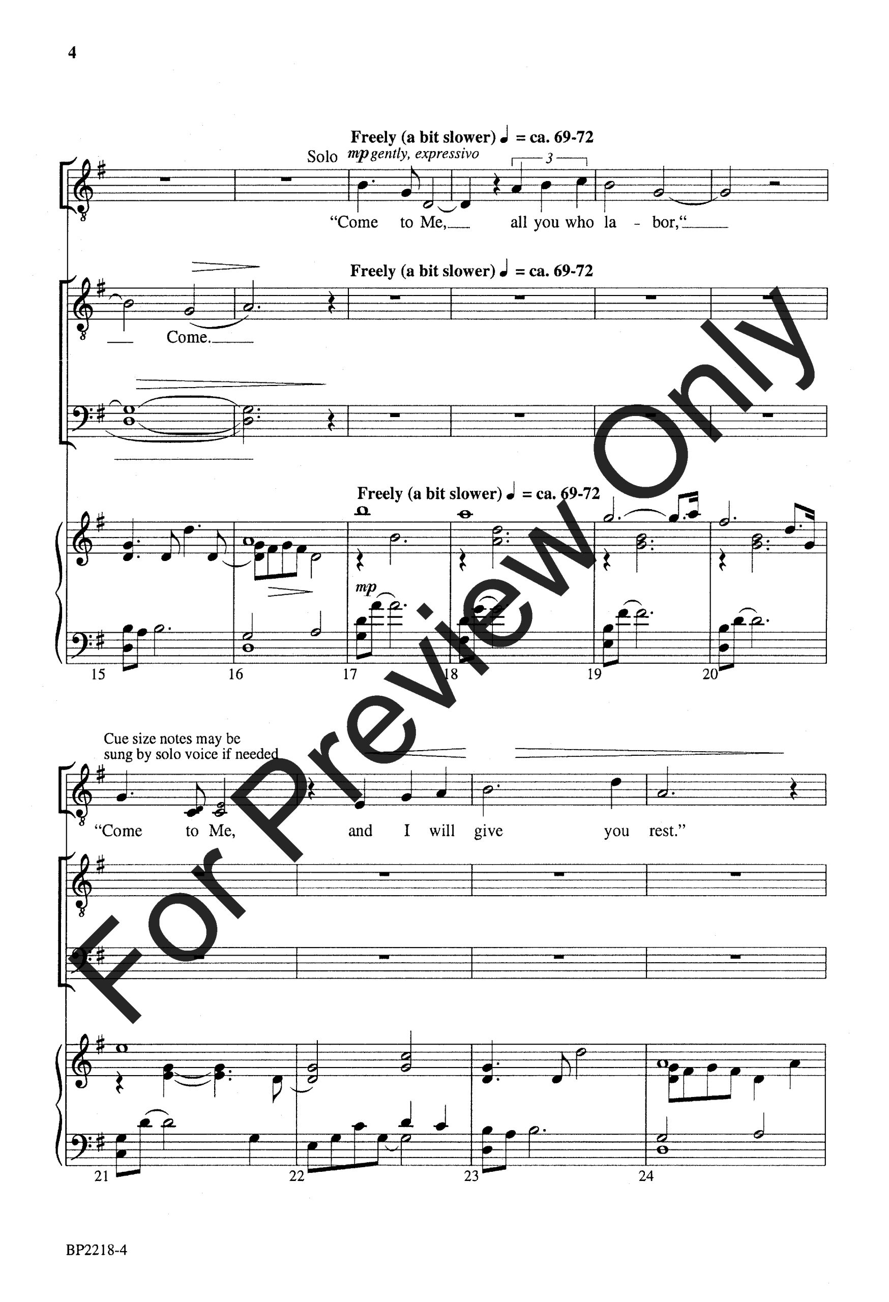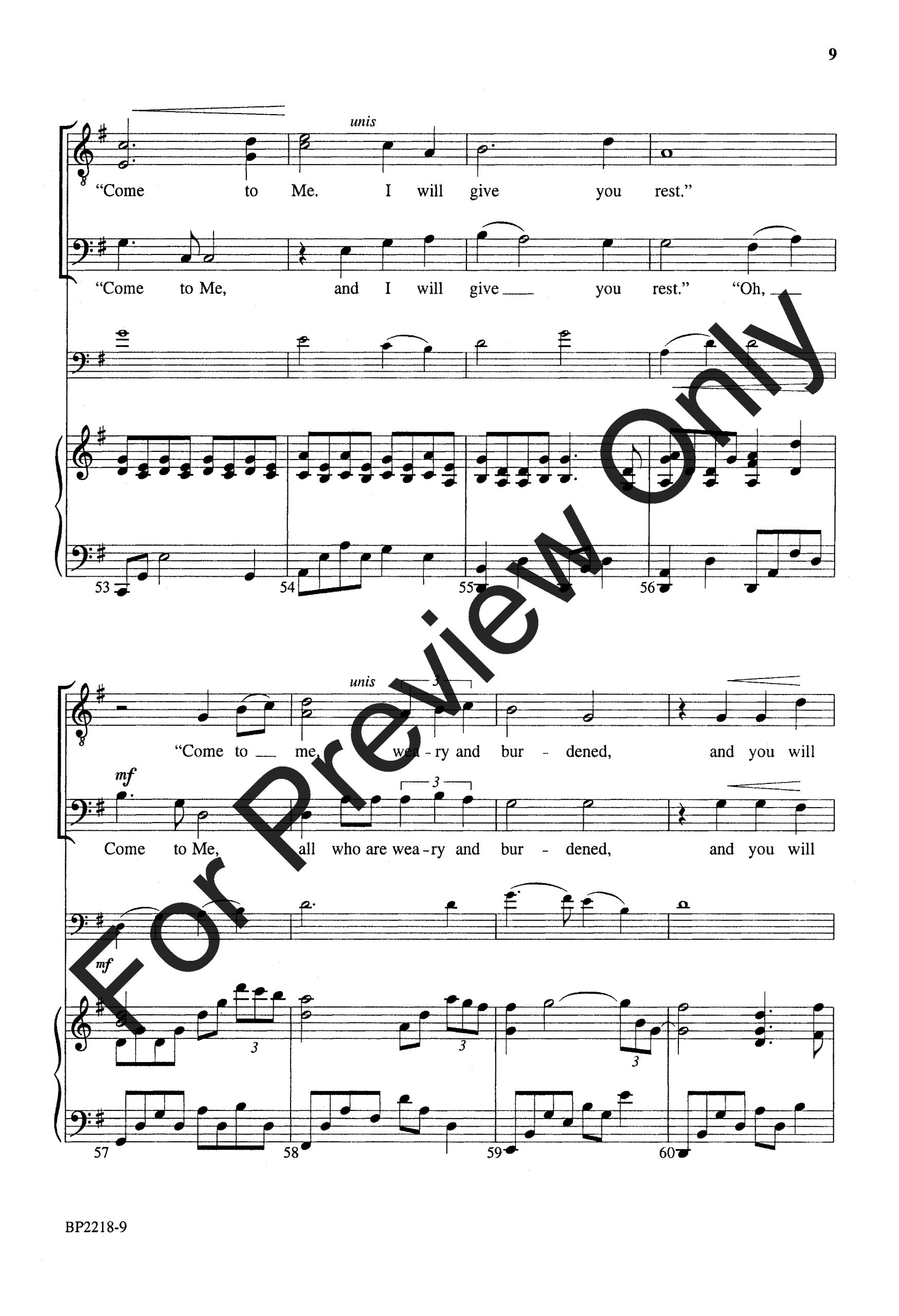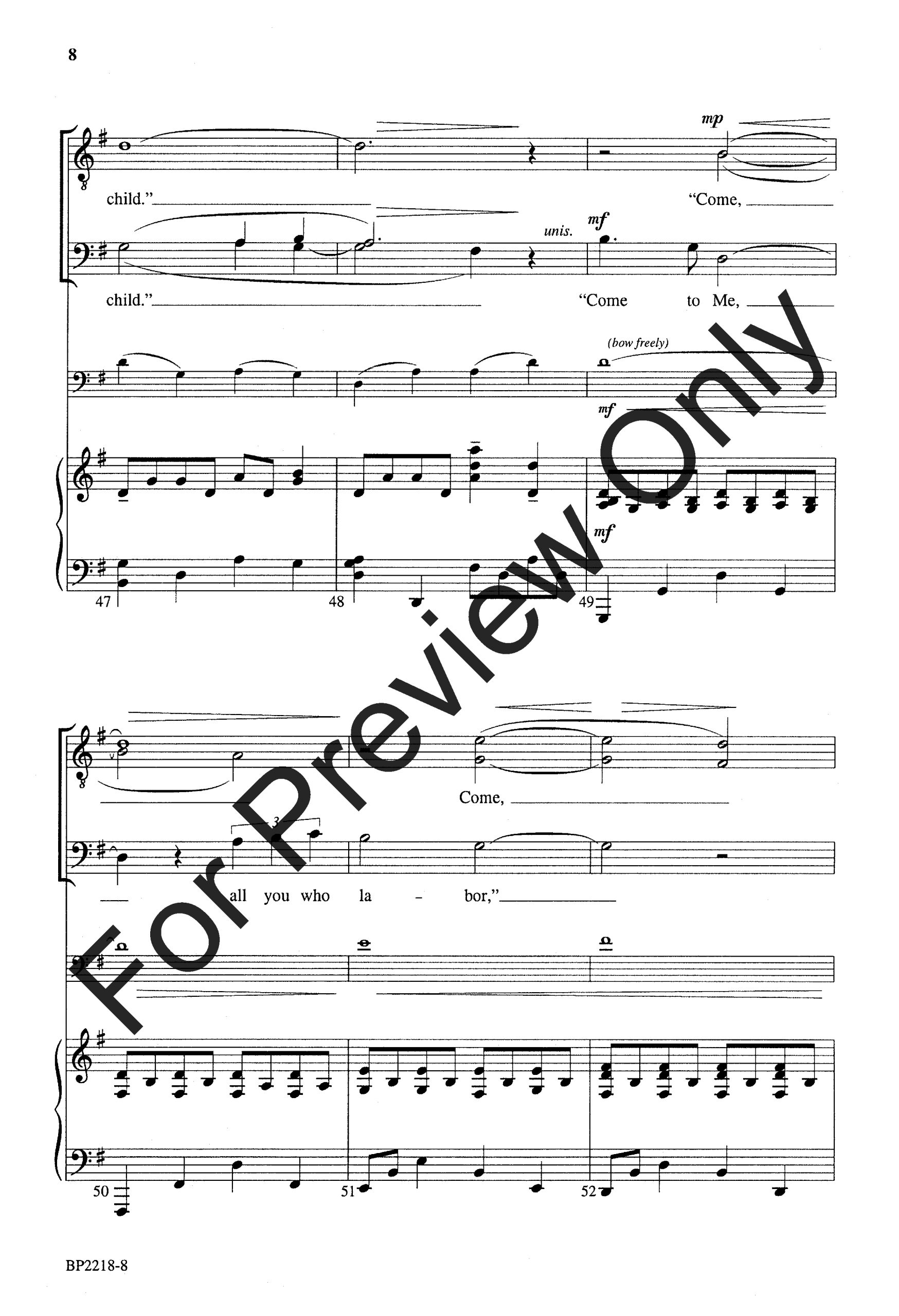 With text adapted from scripture and music to bring the text to life, we can hear the gentle, yet insistent pleading of the Savior to “come” and find rest in Him. Text from Matthew 11:25, 28-29, 2 Corinthians 6:18, and 1 John 3:1. Artfully set for chorus with piano and optional cello, this rich and warm accompaniment is further enhanced with a beautiful solo cello line.