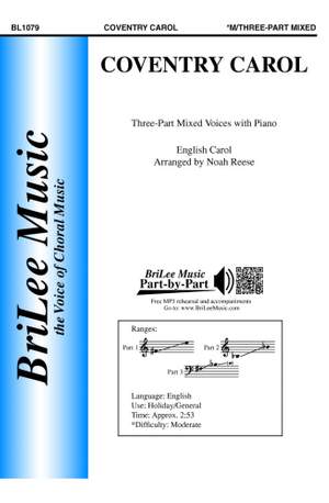 The Coventry Carol is one of the most popular carols in the English language. Dating from the 16th century, the tune has been arranged hundreds of times. Reese's three-part mixed arrangement, with interesting counter melodies and rhythmic twists, has an accessible piano accompaniment, undulating at times and supportive throughout.