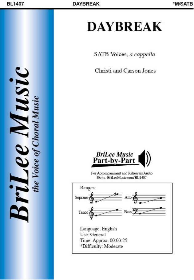 Daybreak by Christi Jones, with contributions from her teenage son Carson Jones, is a powerful a cappella piece for developing mixed choir featuring body percussion. The music begins in a haunting minor key, reflecting on the darkness before dawn. As the piece progresses, the harmonies shift into a bright major key, echoing the hope and renewal that come with the first light of morning. A compelling blend of rhythm and emotion, Daybreak captures the journey from shadow to light with both musical and personal depth.