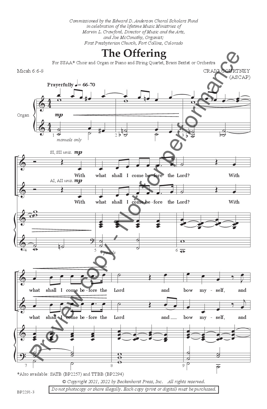 This regal, stately second movement of Craig Courtney’s trilogy, Divine Encounter, is based on Micah 6:6-8. As we partake of God's bounty, our gratitude urges us to offer ourselves as living sacrifices to serve God and people alike. Suitable for use on its own, or as part of the three-movement work; effective in both worship and concert settings.