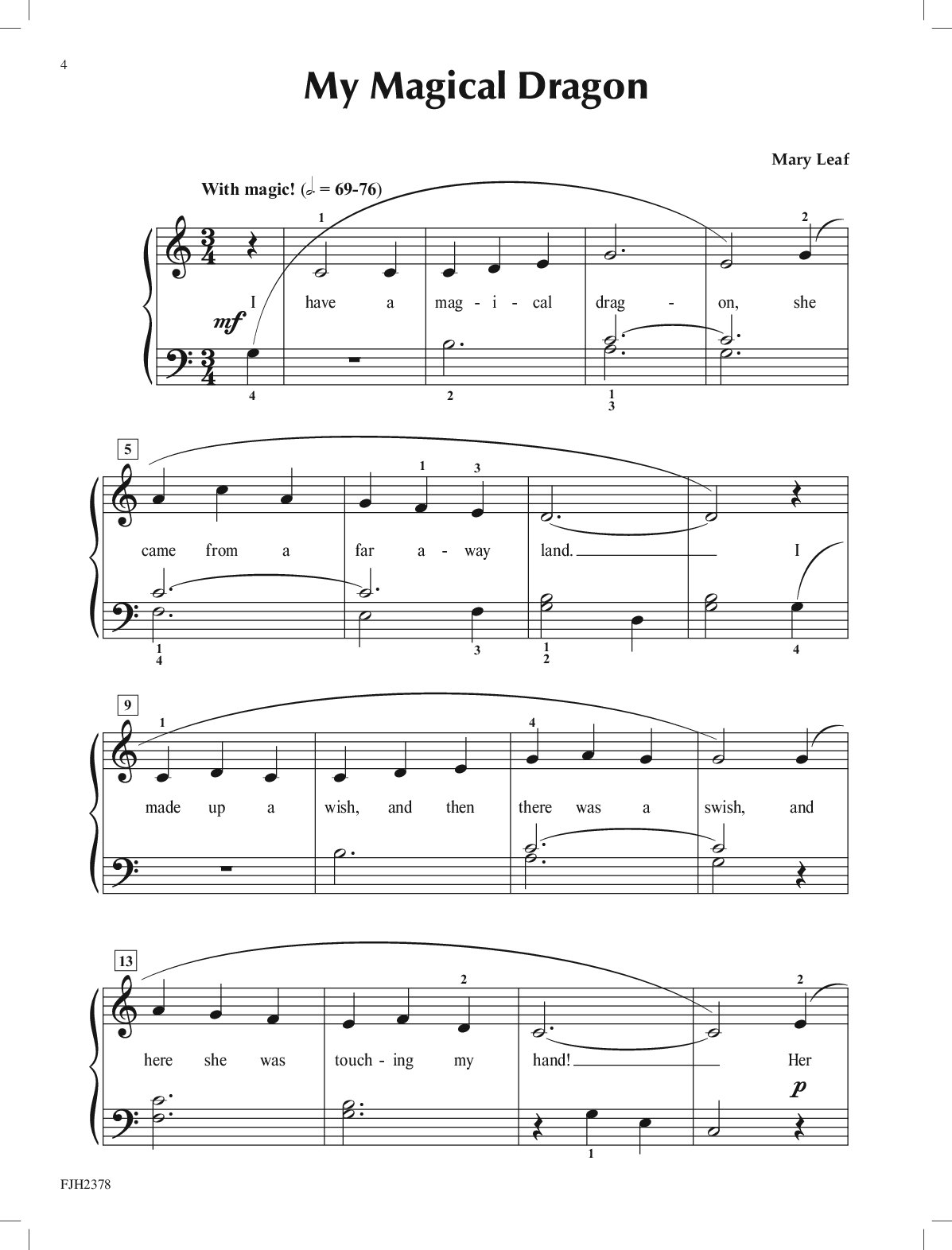 Dragons! Is a fanciful collection of Late Elementary solos based on dragons from different cultures and fantasy tales. Each piece is a wonderful solo with fun lyrics and technically appropriate melodies. Students can immerse themselves in the sound world of a new dragon each week or perform pieces from the collection as a set. From reluctant dragons that don’t want to fight, to a silver dragon that flies in the light of the moon, each piece is crafted by composer, Mary Leaf to be a lasting part of any student’s collection.