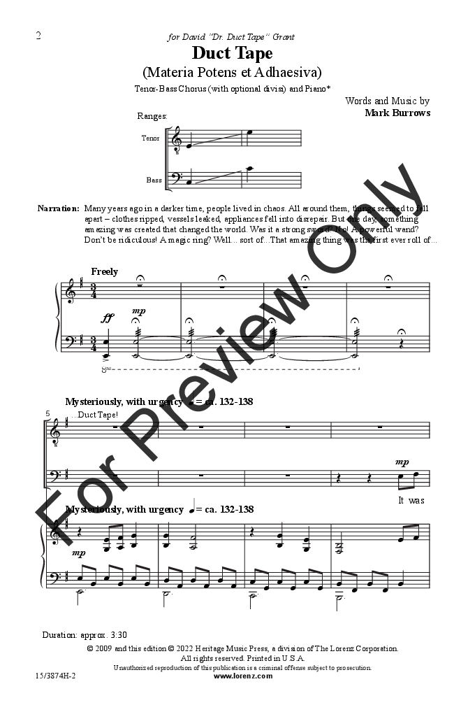 Have a hole in your spring concert program? Looking for that big finale or encore? Never fear, “Duct Tape” is here! Yes, this absolutely hilarious novelty piece, full of intense drama and emotional lyrics, will fit any occasion and repair a broken concert in a jiffy. But this is no mere silly song. It even features a short Latin section extolling the utter greatness of one of the world’s most amazing substances. Don’t get stuck without “Duct Tape!”