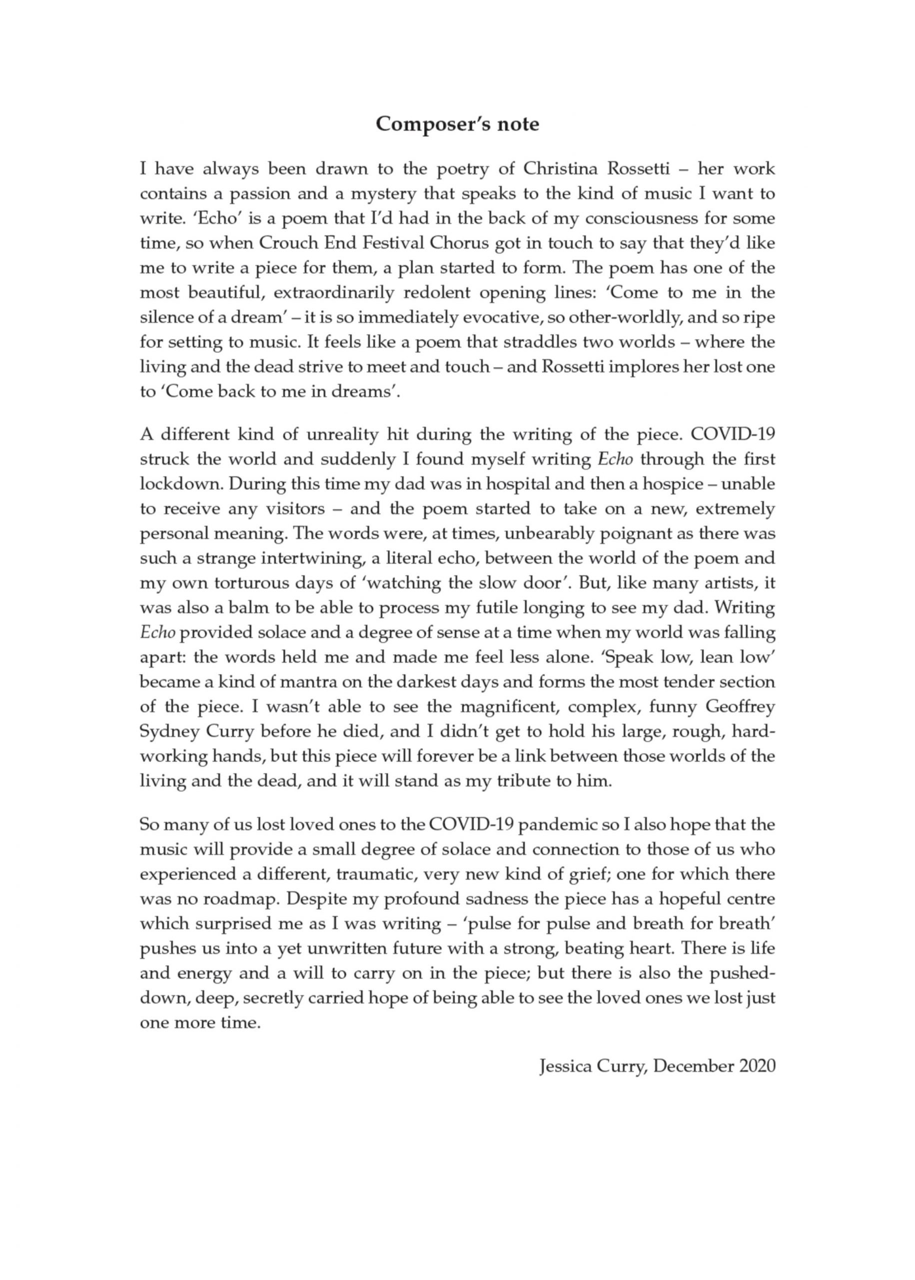 Echo is Jessica Curry's emotive setting of the Christina Rossetti poem for SATB chorus and orchestra, composed for the highly regarded Crouch End Festival Chorus, here available with piano reduction. The piece is Curry's response to losing her father during the COVID-19 pandemic. It serves not only as a reflection on grief but anchors the global events within a deeply personal context, asking that each loss and each life is seen, heard, and remembered. A poignantly beautiful choral work, Echo is characterized by its contemporary and delicately ethereal musical style. Dynamic in its contrasting tones and textures, it is ideal for concert performances. Orchestral parts are available for rent.