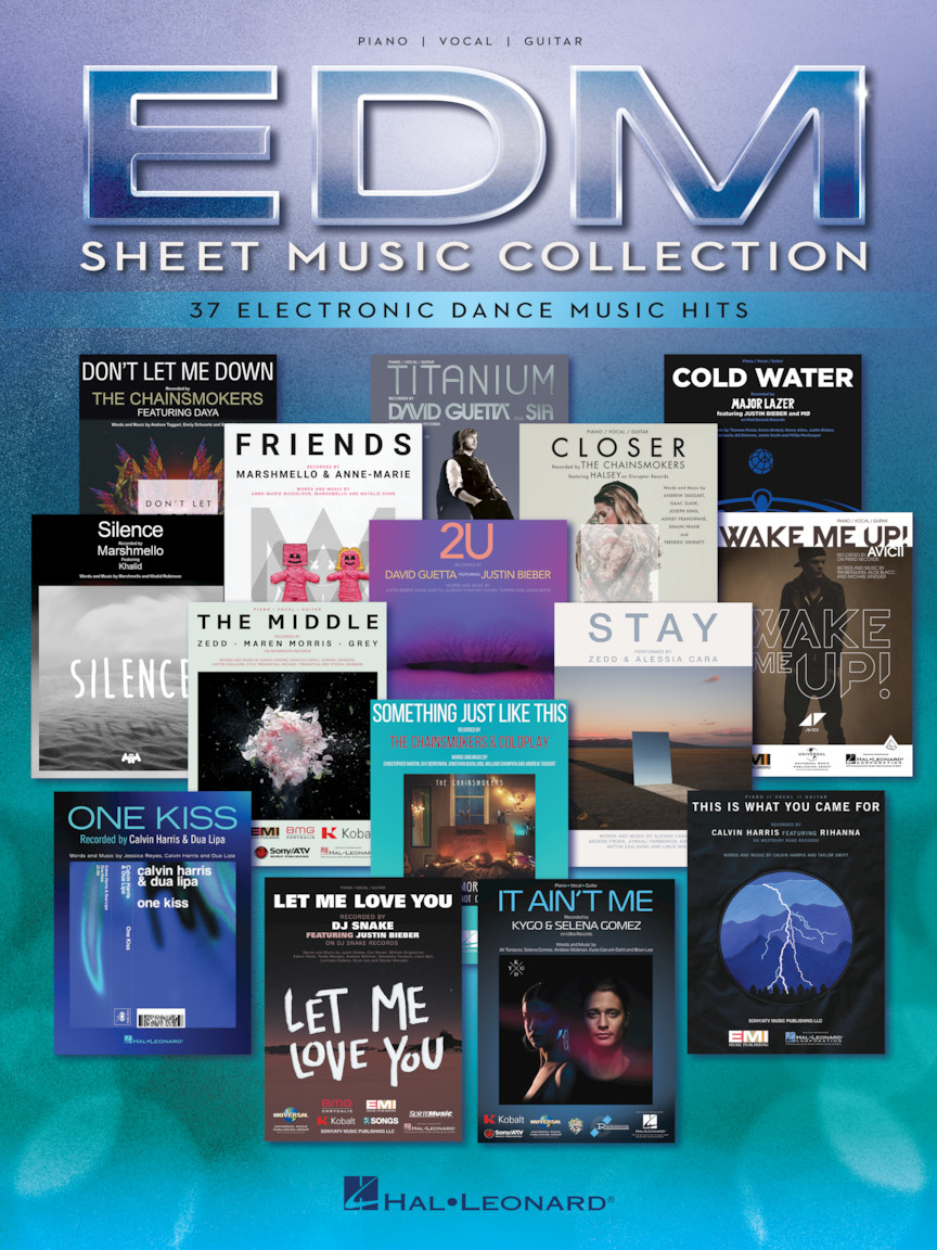 37 hits from the EDM genre are featured in this collection for piano, voice and guitar. Includes: 2U (David Guetta feat. Justin Bieber) • Closer (The Chainsmokers feat. Halsey) • Cold Water (Major Lazer) • Don't Let Me Down (The Chainsmokers feat. Daya) • Friends (Marshmello & Anne-Marie) • It Ain't Me (Kygo & Selena Gomez) • Let Me Love You (DJ Snake feat. Justin Bieber) • The Middle (Zedd, Maren Morris & Grey) • One Kiss (Calvin Harris & Dua Lipa) • Silence (Marshmello feat. Khalid) • Something Just Like This (The Chainsmokers & Coldplay) • Stay (Zedd & Alessia Cara) • This Is What You Came For (Calvin Harris feat. Rihanna) • Titanium (David Guetta feat. Sia) • Wake Me Up! (Avicii) • and more.