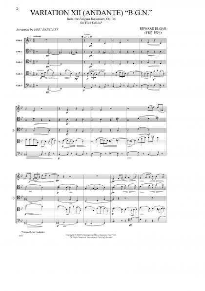 This variation was dedicated to Elgar's cellist friend Basil George Nevelson (B.G.N.), and is now available in this lush arrangement for cello quintet.