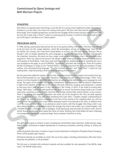 Commission Notice: Commissioned by Beth Morrison Projects: Beth Morrison, President and Creative Producer; Opera Saratoga: Lawrence Edelson, Artistic and General Director; The Ted & Mary Jo Shen Charitable Gift Fund and David and Kiki Gindler. The development of Ellen West was funded, in part, by an award from OPERA America’s Opera Fund: Repertoire Development Fund.