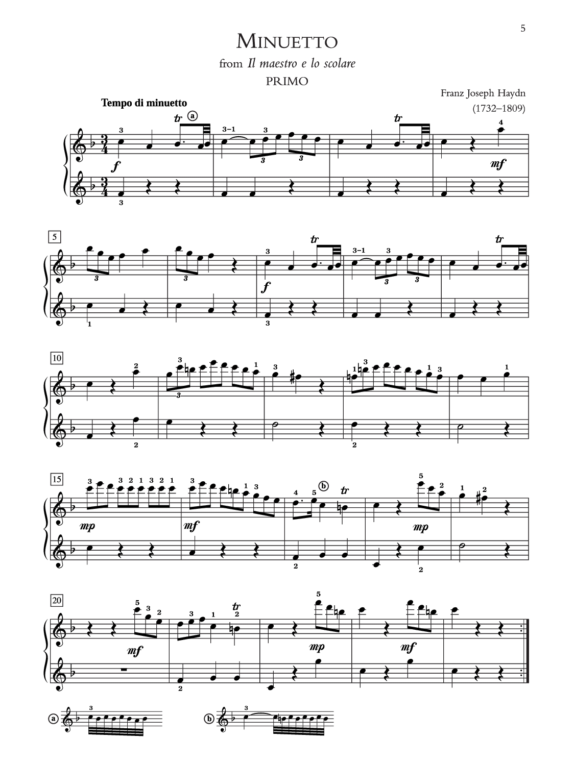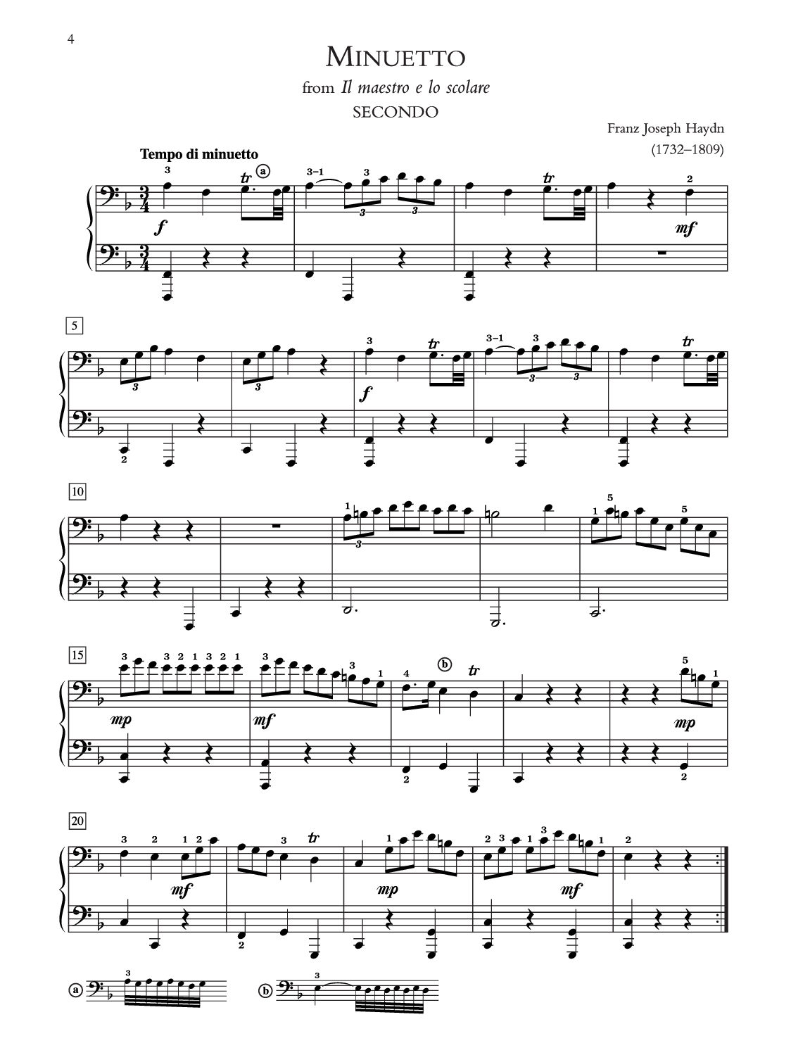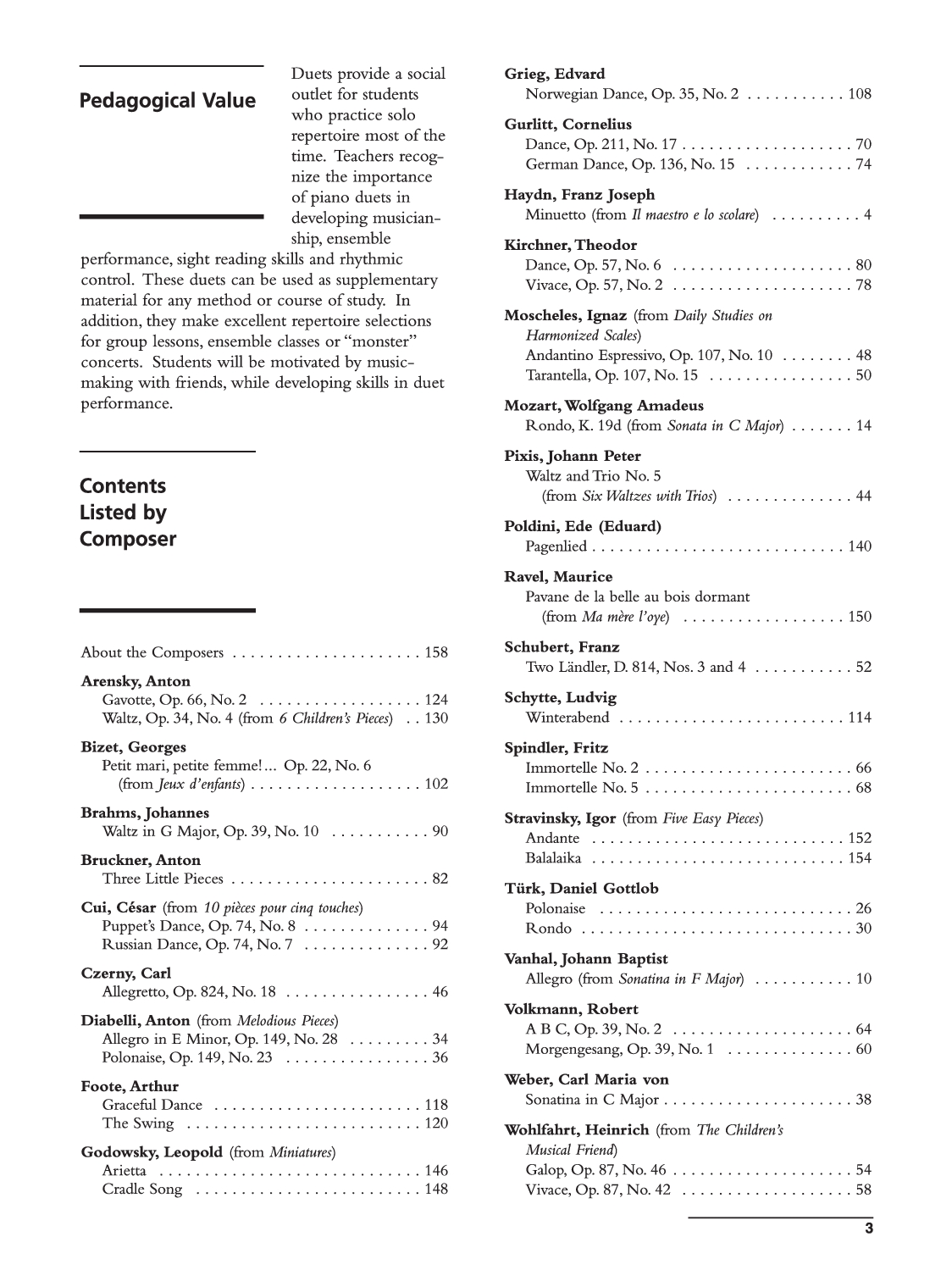 This collection of 40 piano duets (for one piano, four hands) is appropriate for pianists at the late elementary through intermediate levels. Duet repertoire from the 18th, 19th and early 20th centuries are included by such composers as Brahms, Bruckner, Cui, Diabelli, Foote, Godowsky, Haydn, Moscheles, Mozart, Ravel, Schubert, Spindler, Stravinsky, Türk and more. To facilitate reading, the primo and secondo parts are on separate pages. The comb binding creates a lay-flat book that is perfect for study and performance. Essential ornamentation is realized in footnotes, both parts contain measure numbers for convenient reference and brief composer biographies are included.