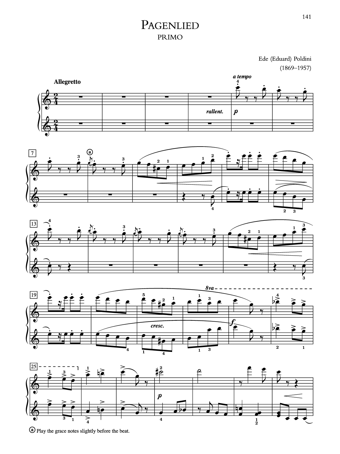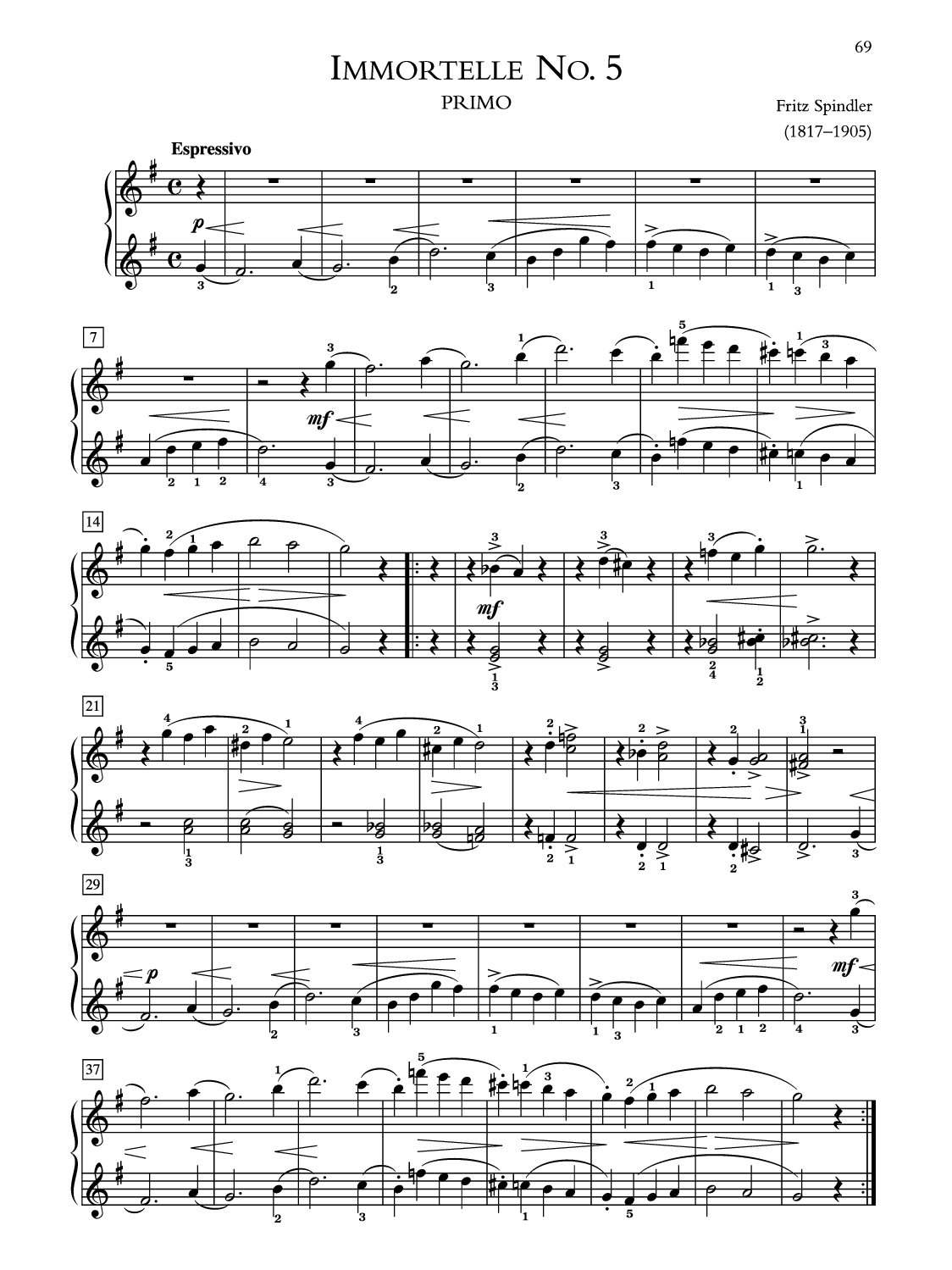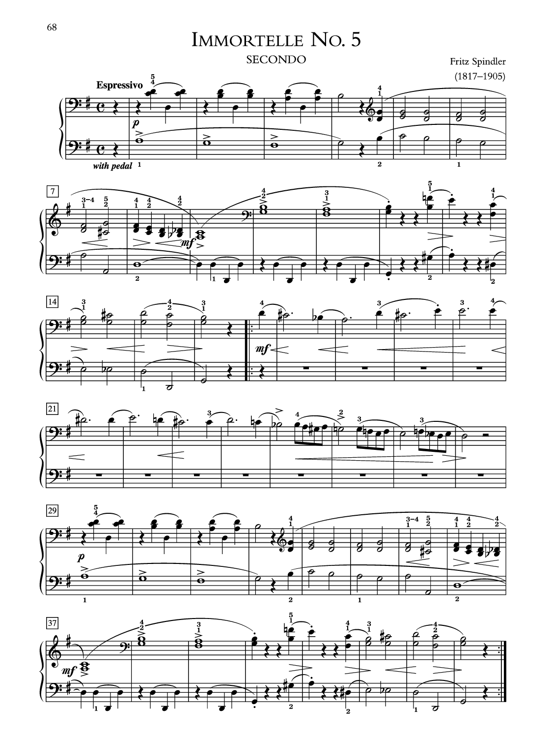 This collection of 40 piano duets (for one piano, four hands) is appropriate for pianists at the late elementary through intermediate levels. Duet repertoire from the 18th, 19th and early 20th centuries are included by such composers as Brahms, Bruckner, Cui, Diabelli, Foote, Godowsky, Haydn, Moscheles, Mozart, Ravel, Schubert, Spindler, Stravinsky, Türk and more. To facilitate reading, the primo and secondo parts are on separate pages. The comb binding creates a lay-flat book that is perfect for study and performance. Essential ornamentation is realized in footnotes, both parts contain measure numbers for convenient reference and brief composer biographies are included.