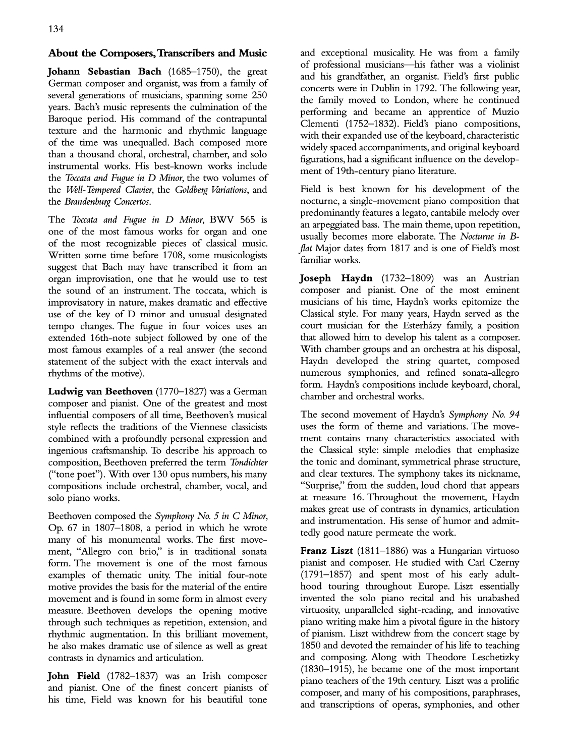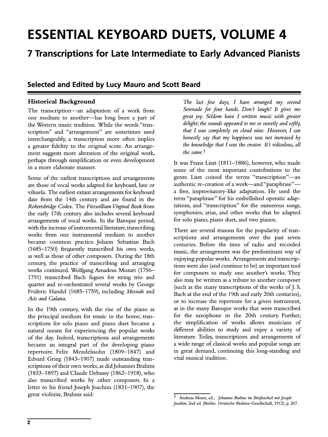These duet transcriptions provide pianists the opportunity to become familiar with a broad range of literature and to experience well-known works in a more immediate and in-depth manner. The pieces in this collection make excellent repertoire selections for piano ensemble classes, in both the private studio and at the college level. The comb binding creates a lay-flat book that is perfect for study and performance.