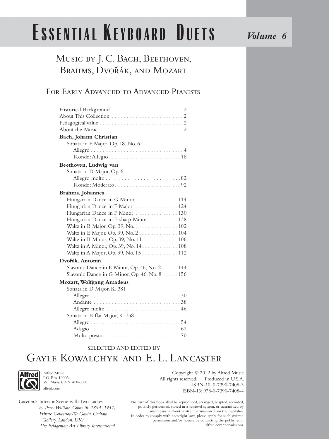 This collection of piano duets (for one piano, four hands) includes the most popular Classical and Romantic repertoire and is appropriate for early advanced to advanced pianists. It includes music by J. C. Bach, Beethoven, Brahms, Dvorák, and Mozart. The primo and secondo parts are on separate pages and essential ornamentation is realized in footnotes. Both parts contain measure numbers for easy reference. The comb binding creates a lay-flat book that is perfect for study and performance.