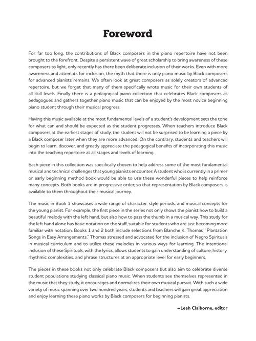 The Expanding the Repertoire series aims to bring previously unsung piano literature to students and teachers for memorable discoveries. This elementary to upper elementary level volume features music of Black composers in progressive order, and includes pedagogical notes by Leah Claiborne, an expert in the field.