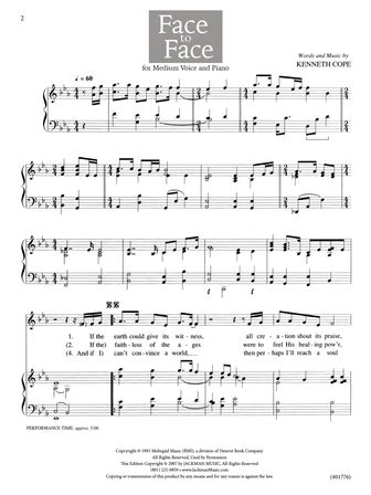 Vocal solo for medium voice and piano, on the Savior's sacrifice and mission: “Though He knows of my praise–one day, I'll tell Him face to face.”